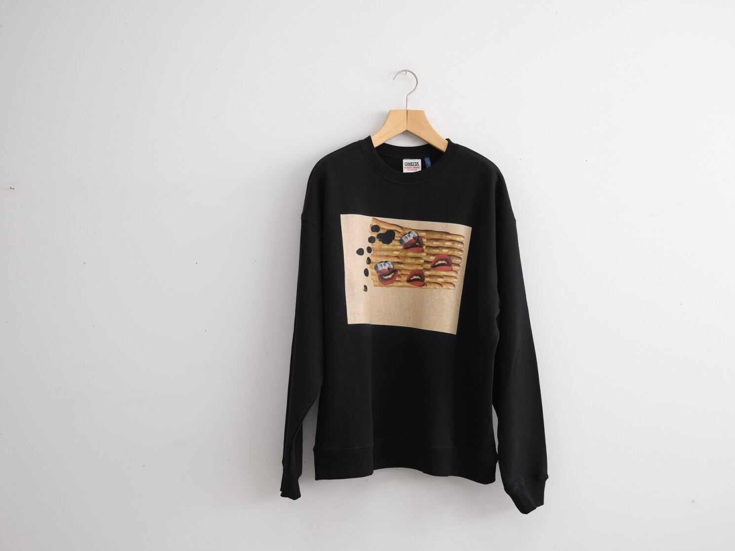 アーティスト、CHRISTOPHE BRUNNQUELLとコラボスウェット。フロントにコラージュ作品を、バックにロゴプリントが入ります。