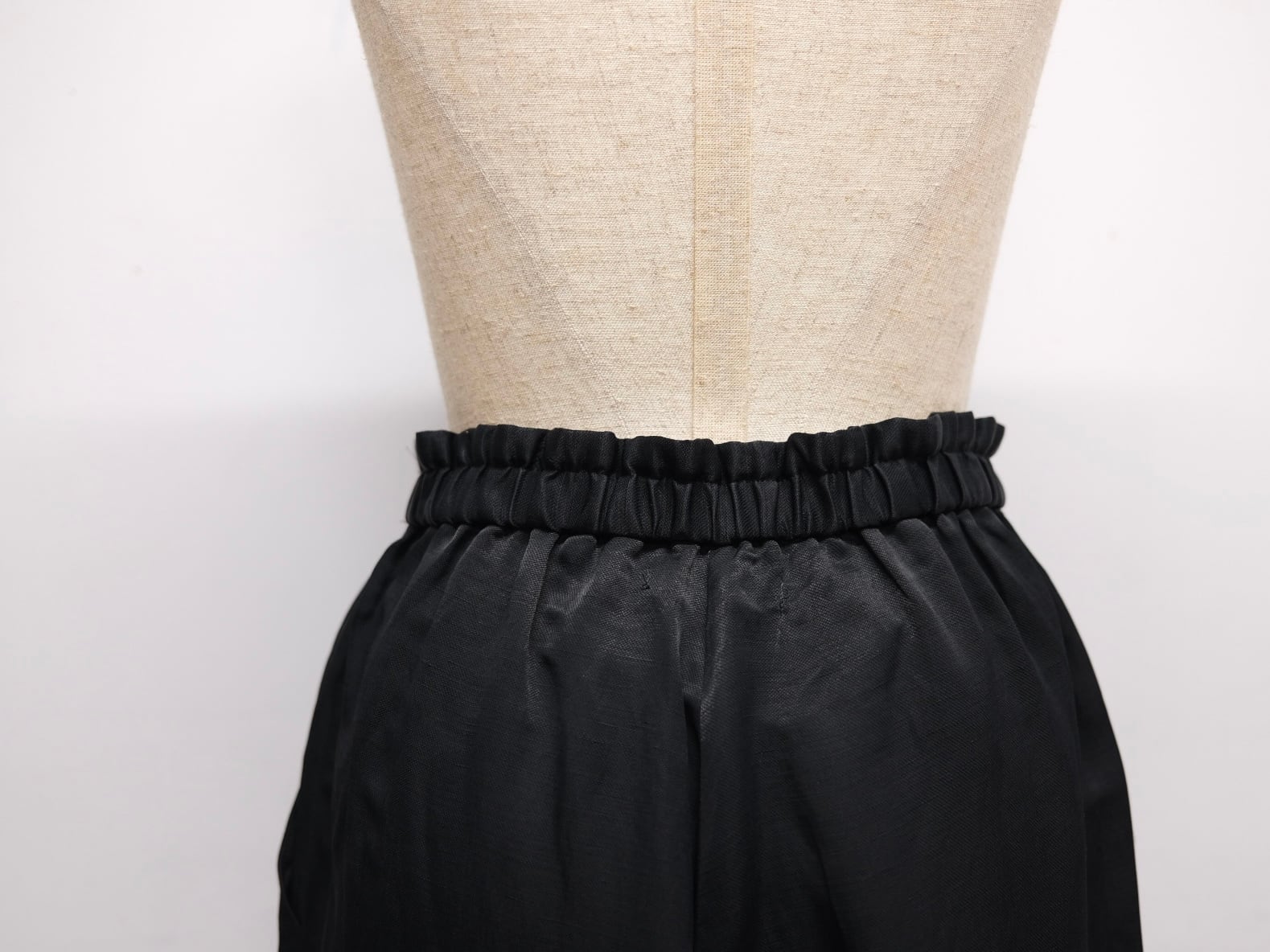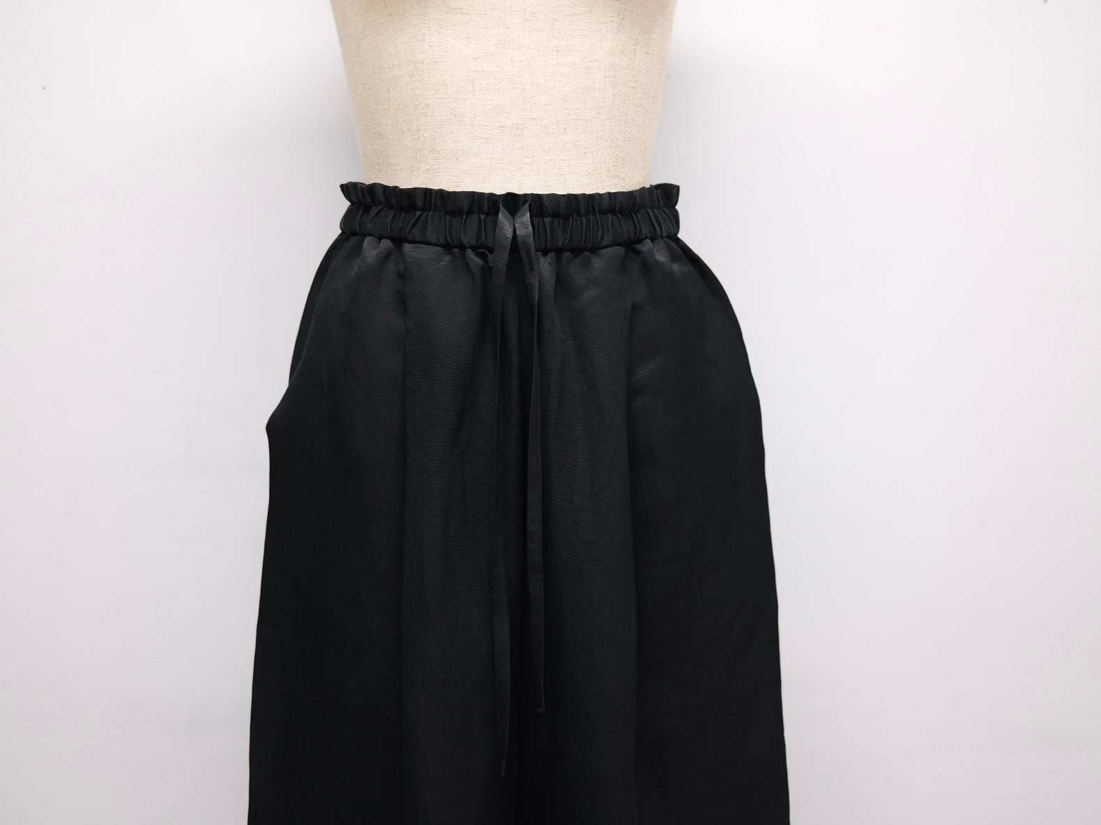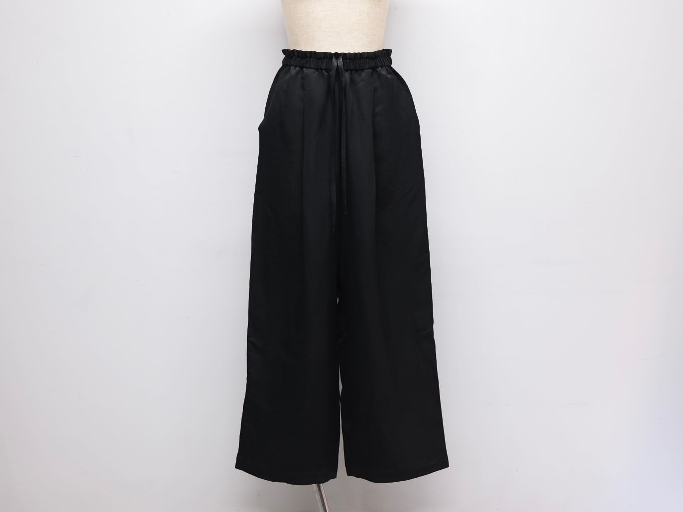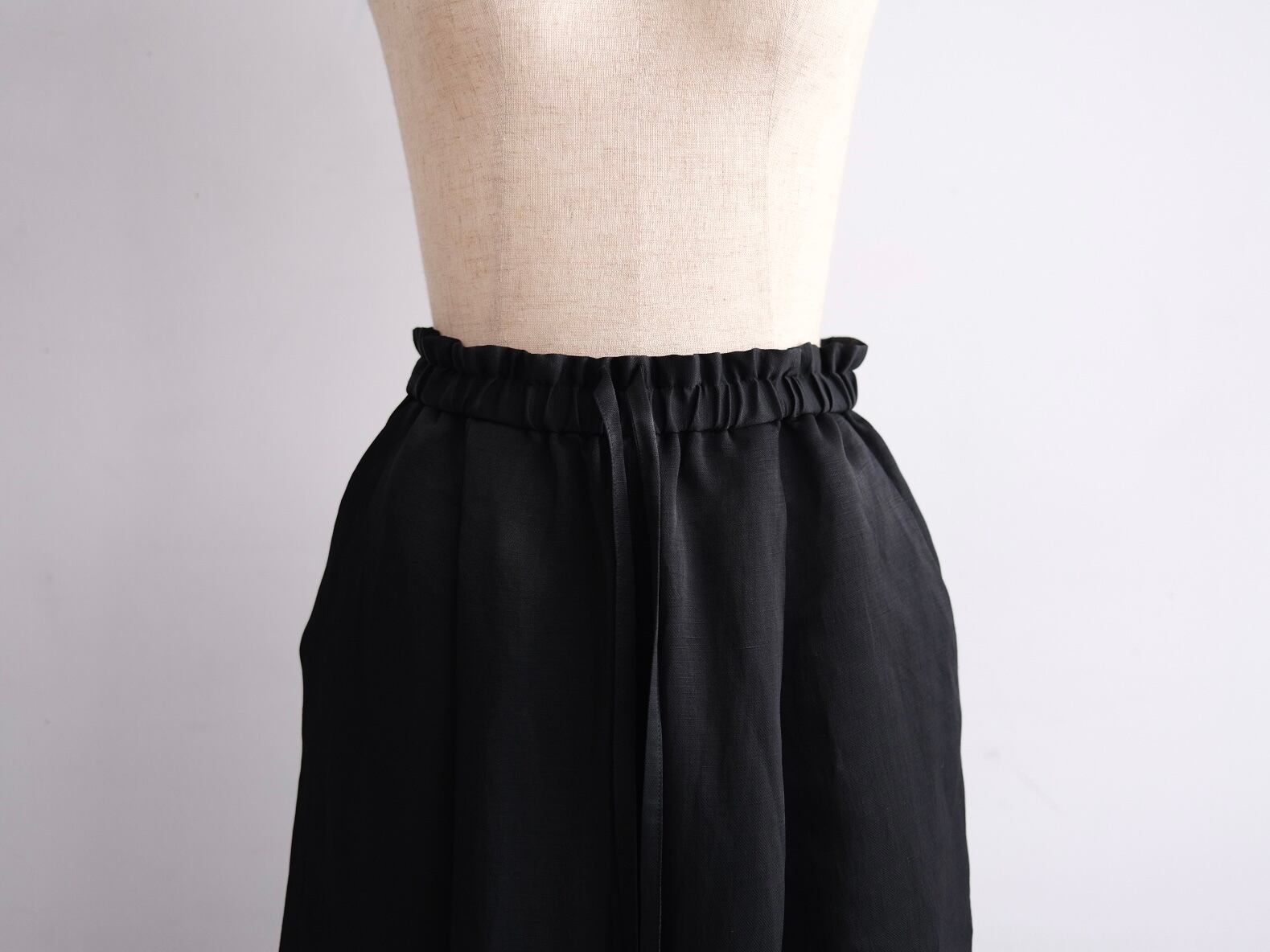 Color Black Quality Cupra63%, Linen 37% Size 34 ウエスト62cmー88cm股上36cm股下70cm裾幅19cm ¥39000+tax キュプラ×リネン生地を使用したイージーパンツ。 やや太めのリラックス感あるシルエット。 ウエストはゴムと紐付きです。