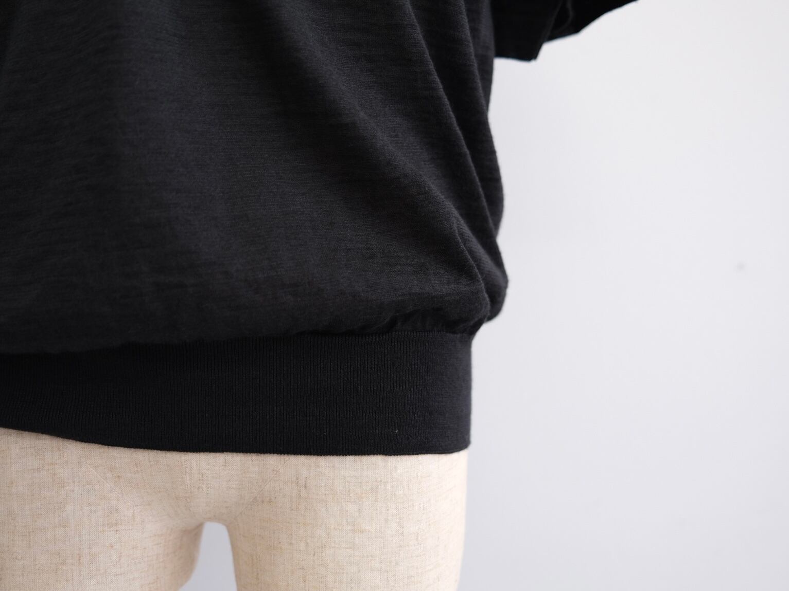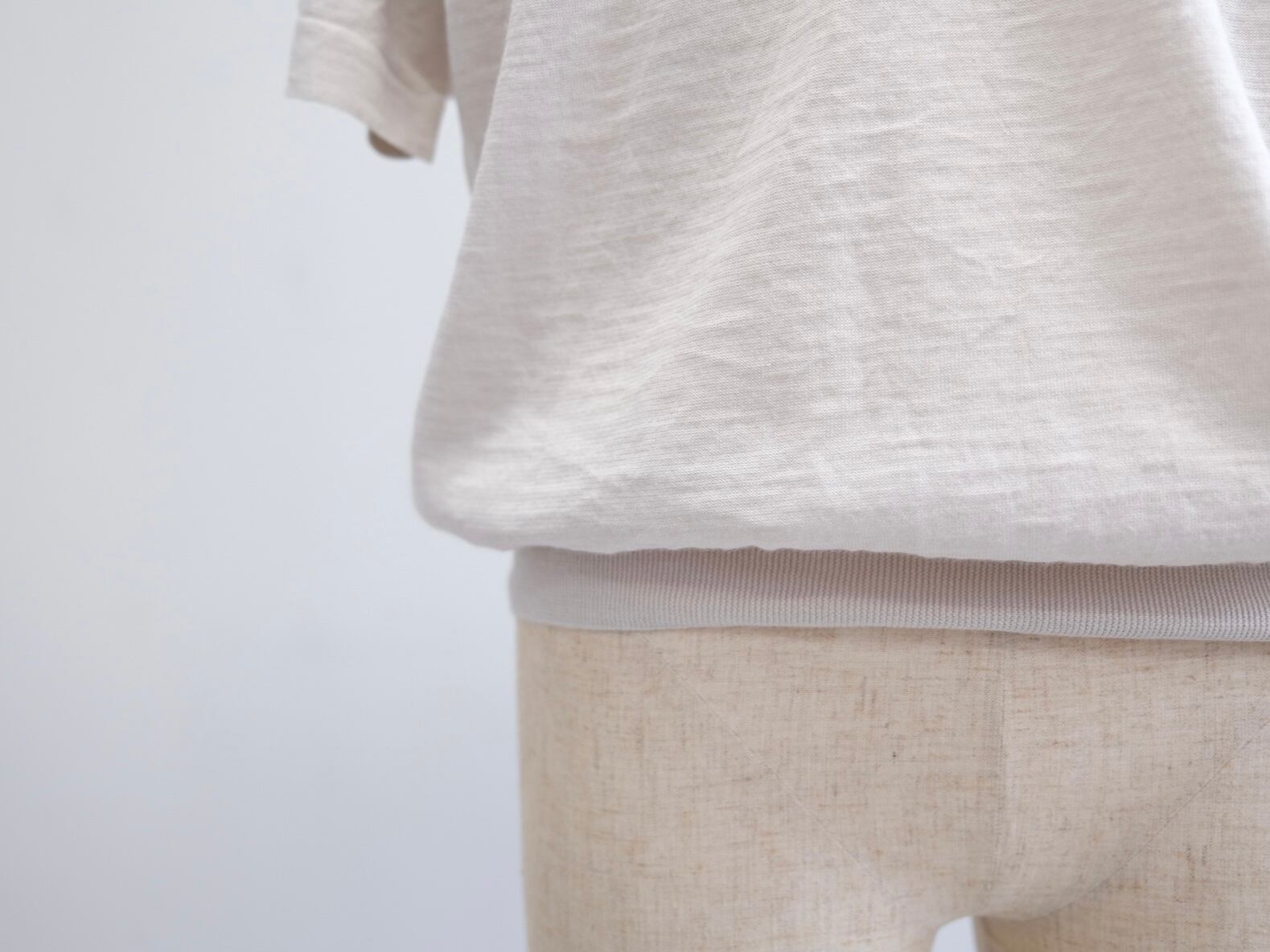 光沢感と清涼感が特徴のロイヤルラミーを極細番手に紡績した繊細な糸を使用。ハイゲージの編機でゆっくりと編立て、ラミー特有のハリコシと透け感、凹凸感やシボ感があり表情豊かで肌離れの良い商品です。※製品の性質上斜行します
