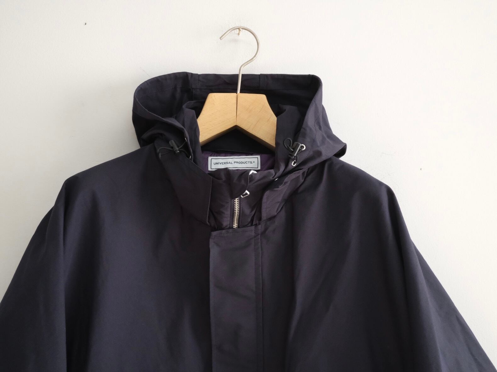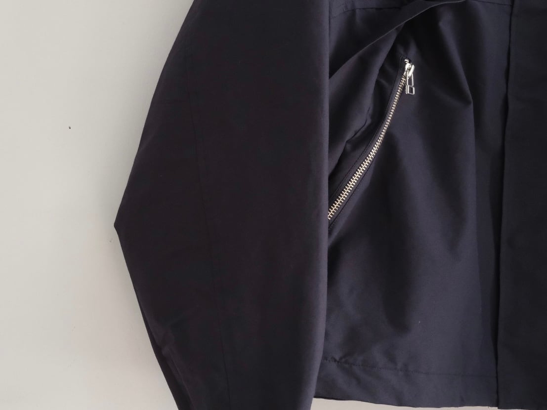 スタンドカラーで収納できるフードをつけ、フード周りにはフィット感を調節するアジャスター付き。