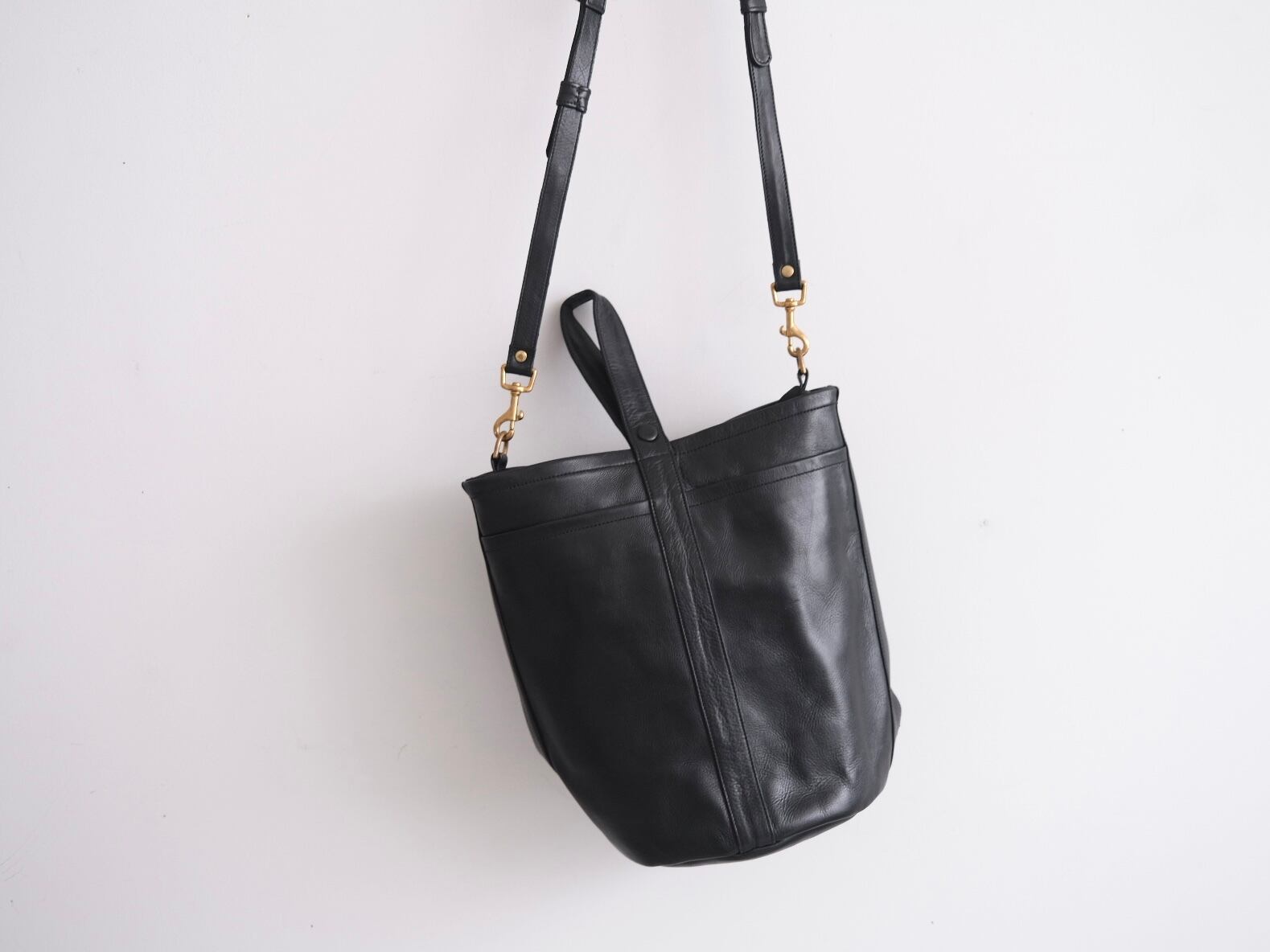 バケツ型フォルムとワンハンドのデザインが特徴的な巾着型バッグ。フロントには便利なポケットを備え、実用性も抜群です。持ち手の紐を調整することで、手持ちから肩掛けまで自在に使い分け可能。