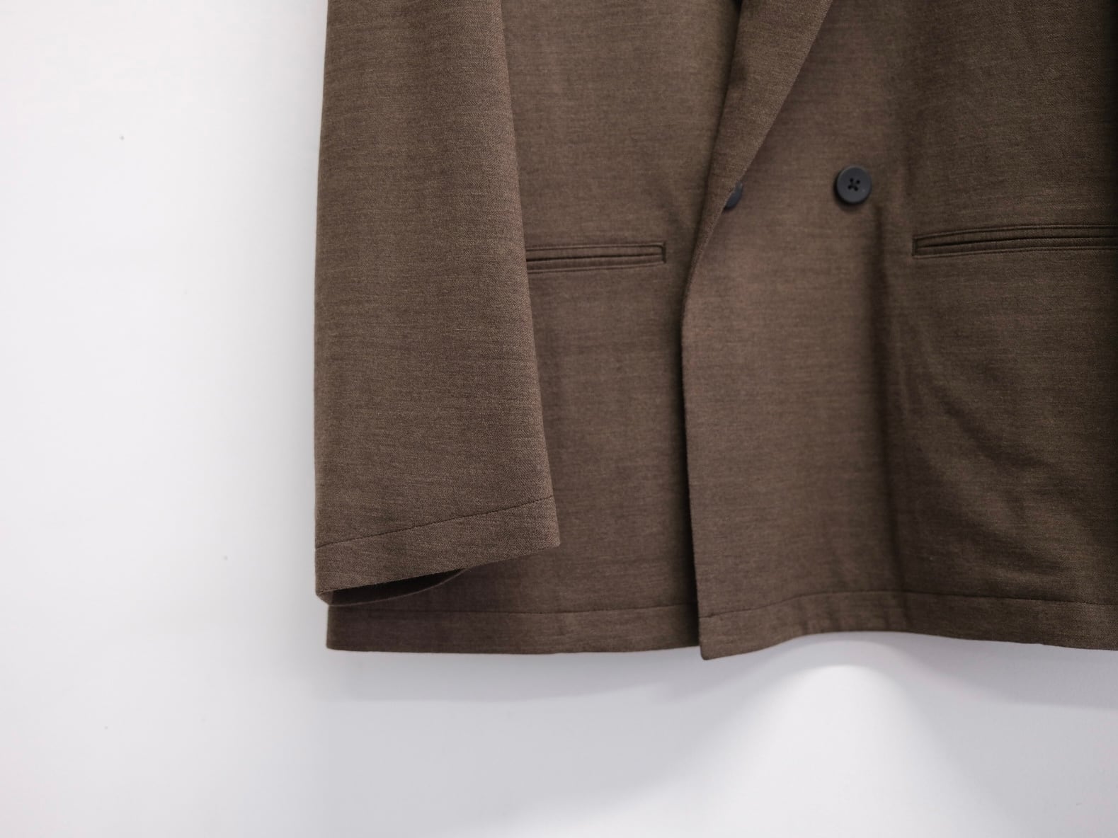 小ぶりな釦が特徴的で、素材の落ち感を活かし、開けても釦をかけても決まるように前身ごろに分量を計算して取っております。