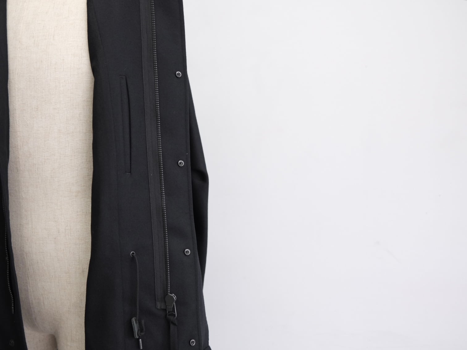フロントに配置したチェンジポケットはミニマルな佇まいの中に程良いアクセントと機能性を兼ね揃えています。フィールドコートのアウトラインによる実際の分量感を感じさせないフォルムもポイントです。