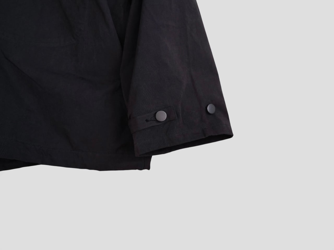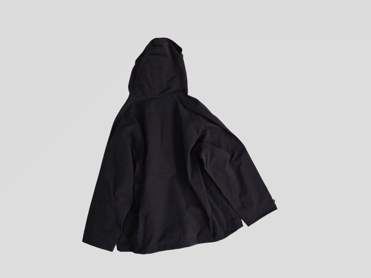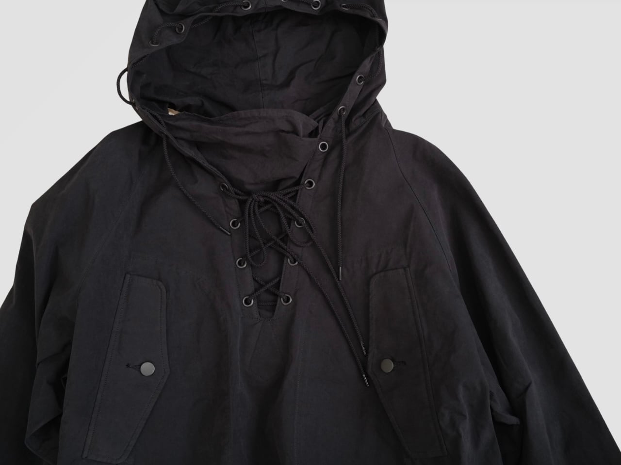 - 前あきからフードまでぐるりと配置した金属鳩目が特徴