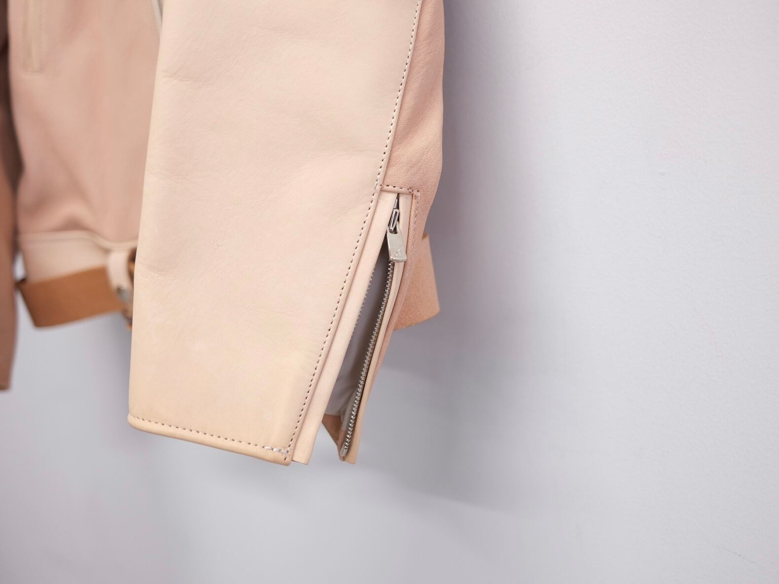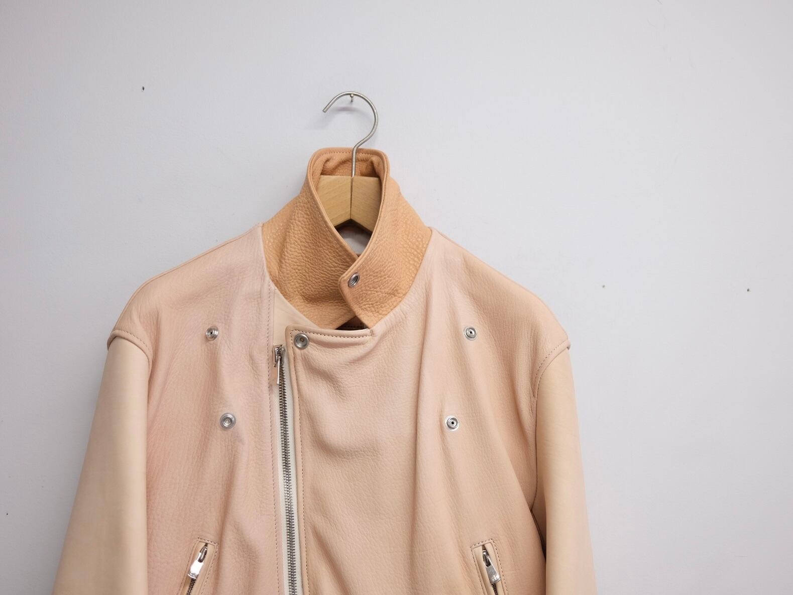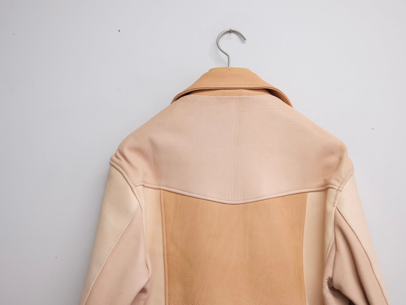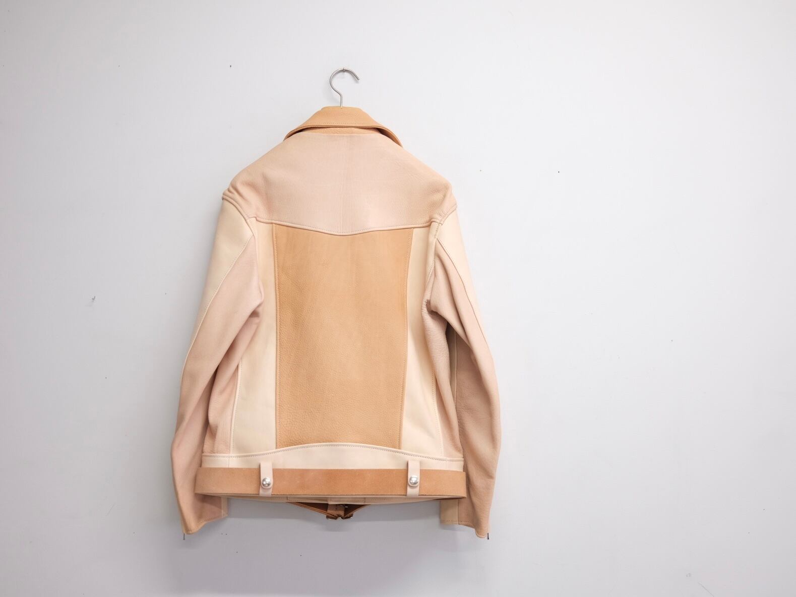 様々な革の種類のヌメ革を組み合わせて制作したライダース型のジャケットです。革の組み合わせで同じ物がない、一点物の商品となります。