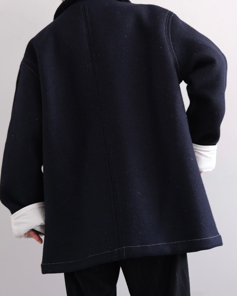 両面ジェイコブ・シープウール・メルトン生地のコントラストのある裏面が見えます。