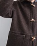 伝統的なダッフルコートのトグルは、革パッチの下に留められたコードで留められています。この余分な素材を省き、トグルループをしっかりと固定するため、アンブラーコートのコードは、生地の表地に縫い付けられたボタンホールを通して、見返し自体にセットされています。隠されたコードは、トグルを留めたり開いたりするのにちょうど良い長さで、使用時には生地の重みで引き戻してしっかりと固定します。トグル自体は、テンダーのナイフ職人によって、FSC認証を受けたマホガニー無垢材から英国で一つ一つ手作りされており、バレーフォージの兵士が携行していた角のある「主婦用裁縫道具」のデザインに基づいています。