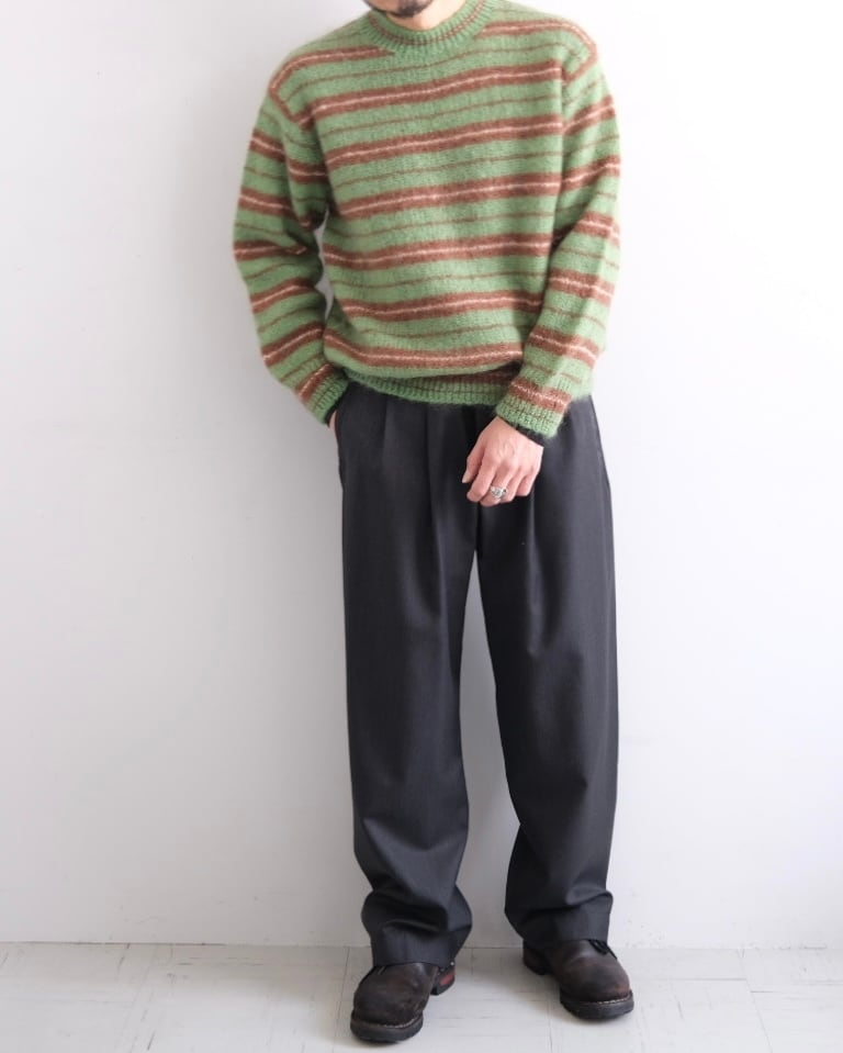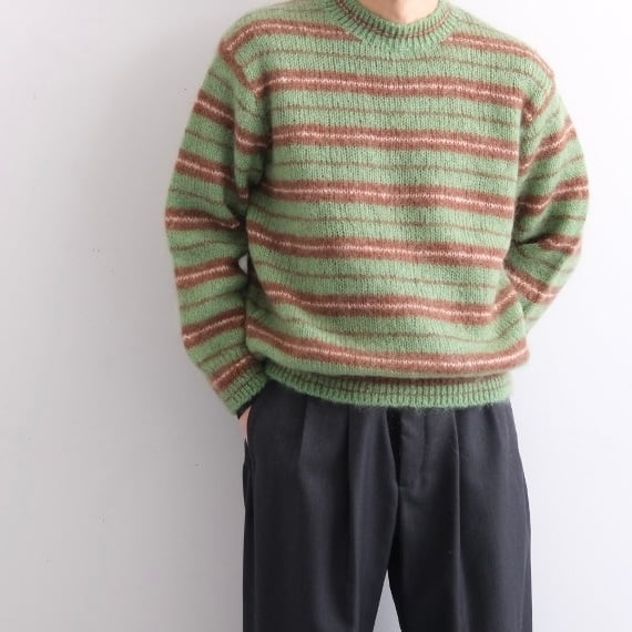 上質なモヘヤウール糸を使い、ざっくりとレトロなボーダー柄で編み上げたローゲージセーター。