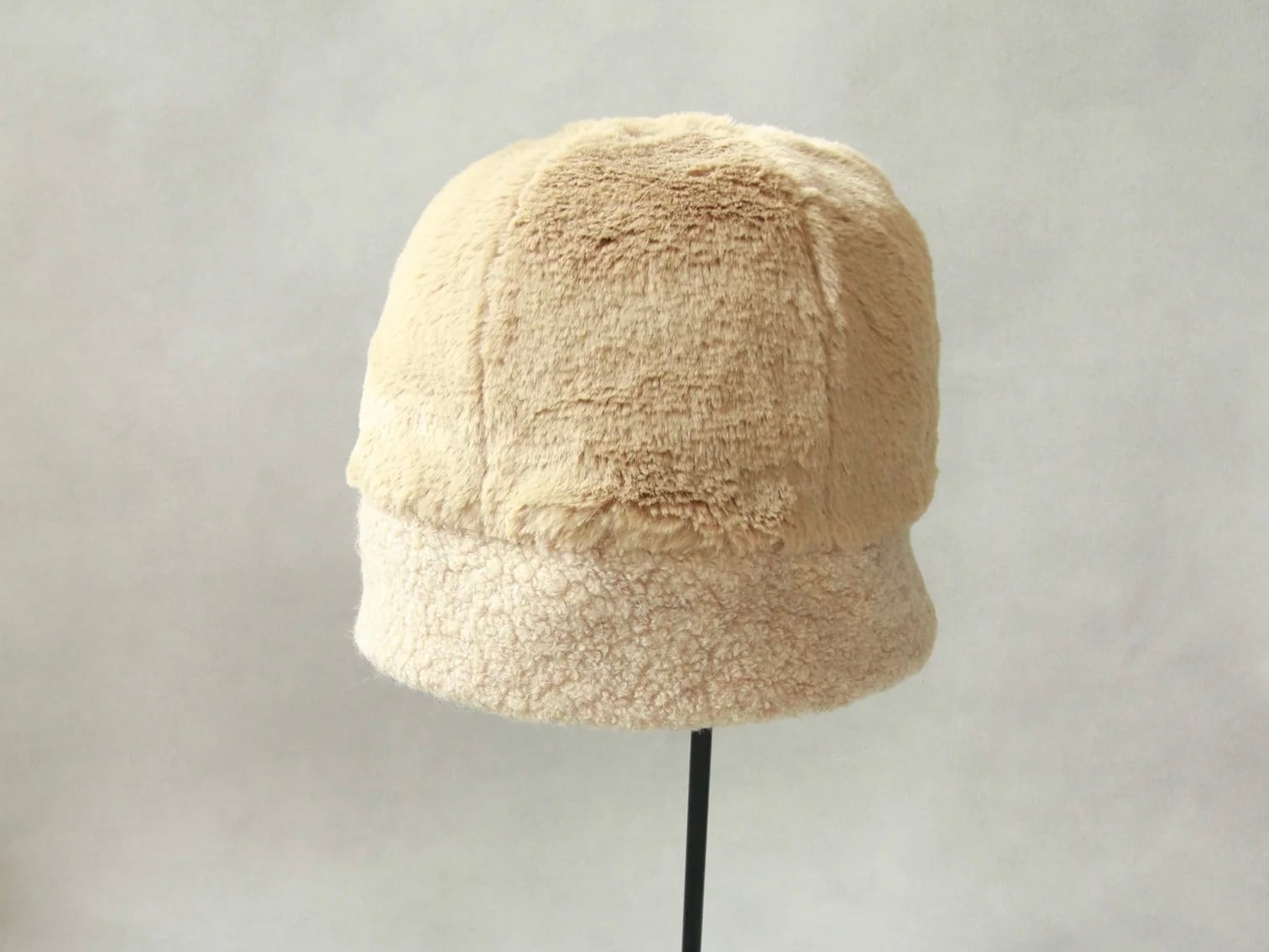 クラウンには本格的な艶と肌触りが特徴のフェイクファー、ツバにはアンゴラ混のボリューム感あるボアを使用しています。