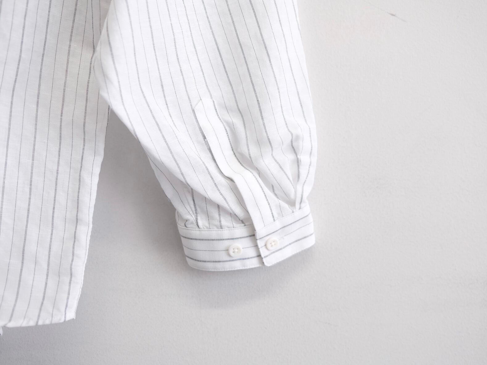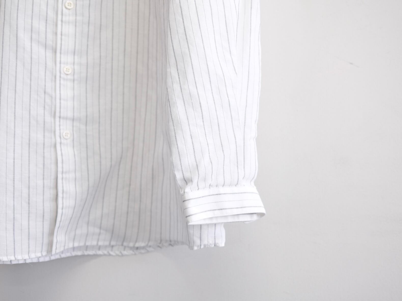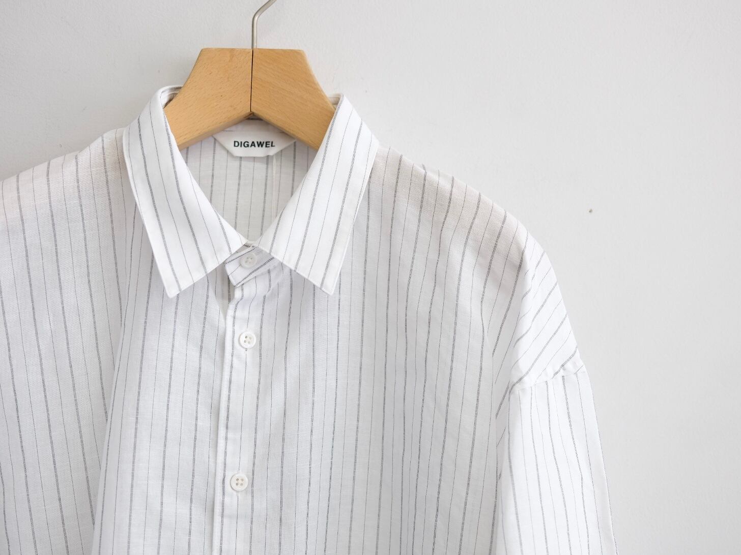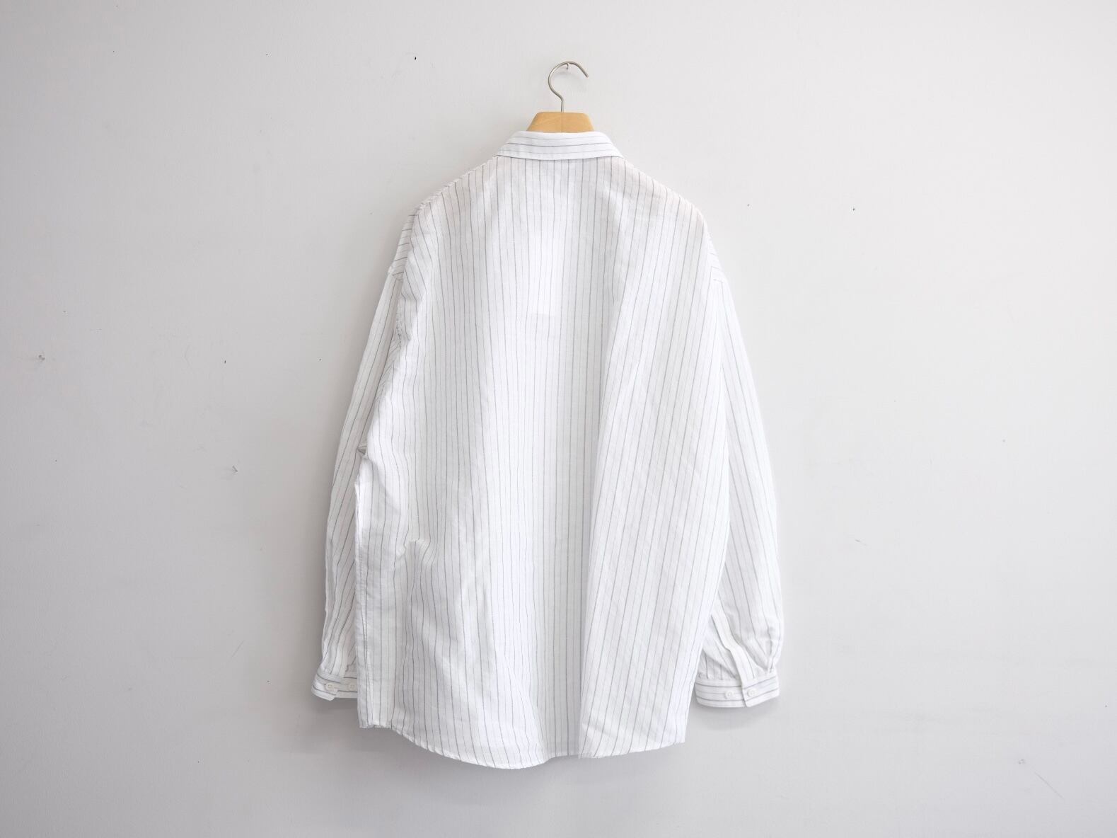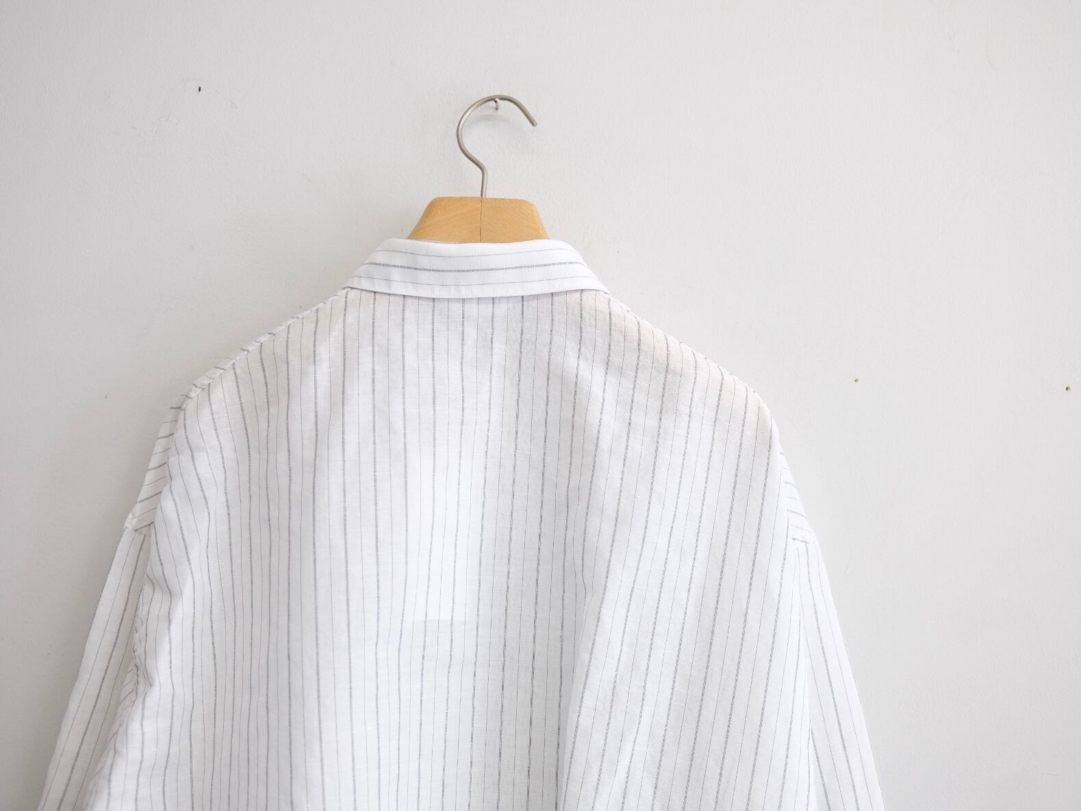 DWAA034 Quality Cotton45%,Linen55% Color Black Size 1 Price ¥25000(+tax) 定番オーバーサイズドシャツコットンリネンストライプ。製品洗い加工を入れることで自然なパッカリングに見えるよう設定しています。 製品加工の為、若干の個体差があります。 Size 1 肩幅59cm身幅69cm着丈81cm袖丈57cm