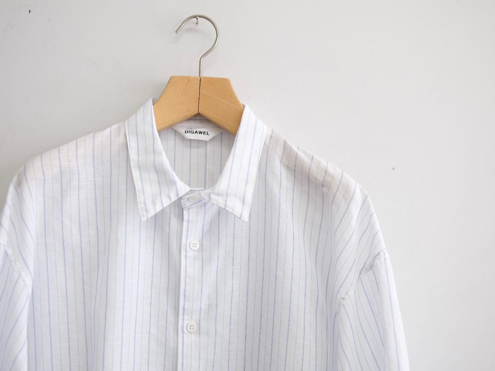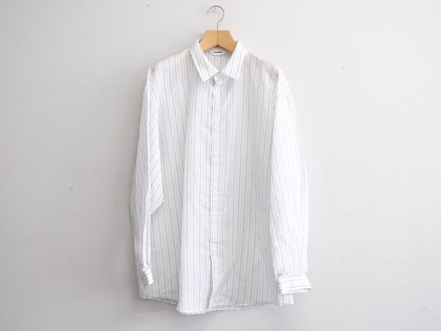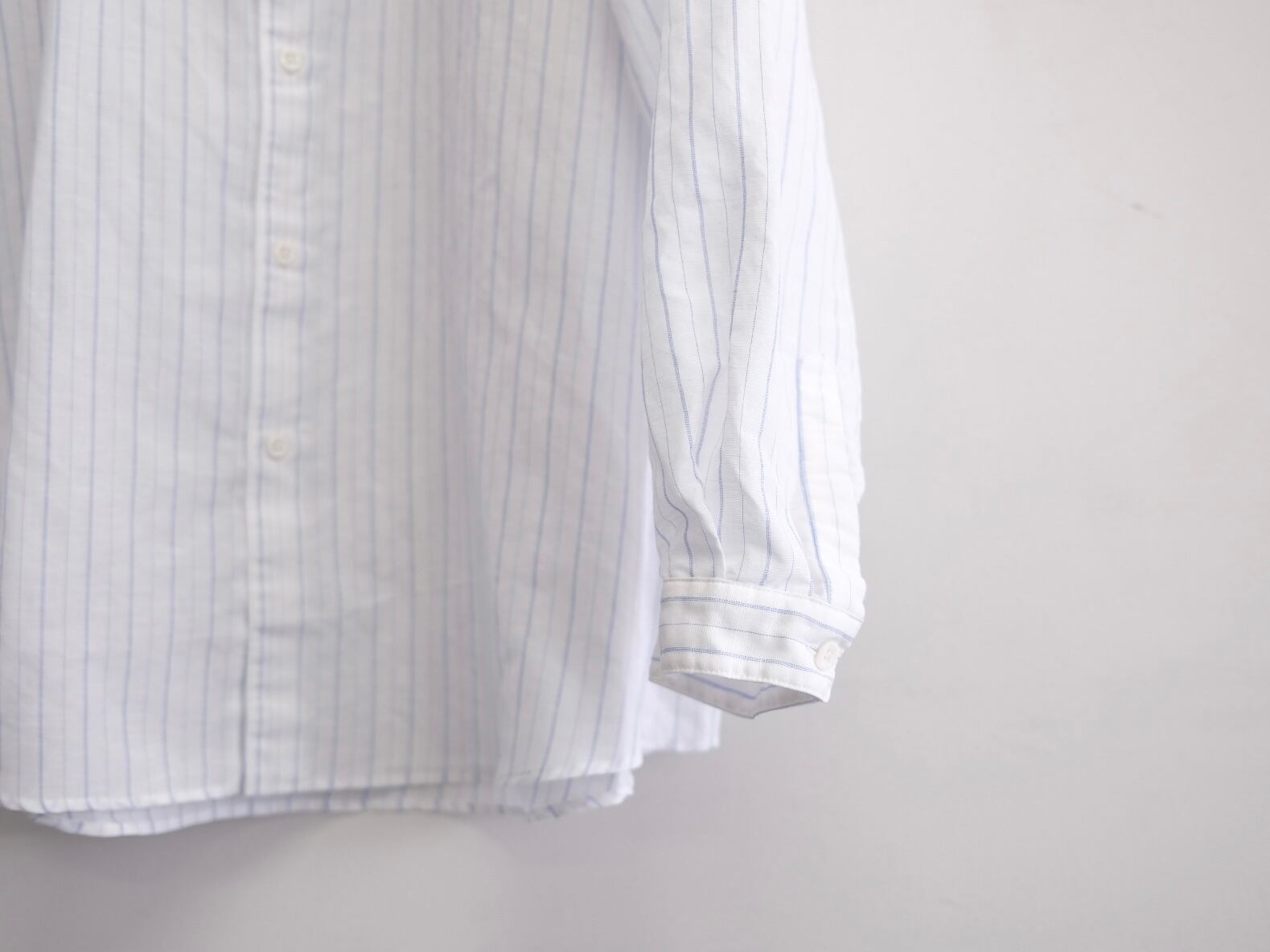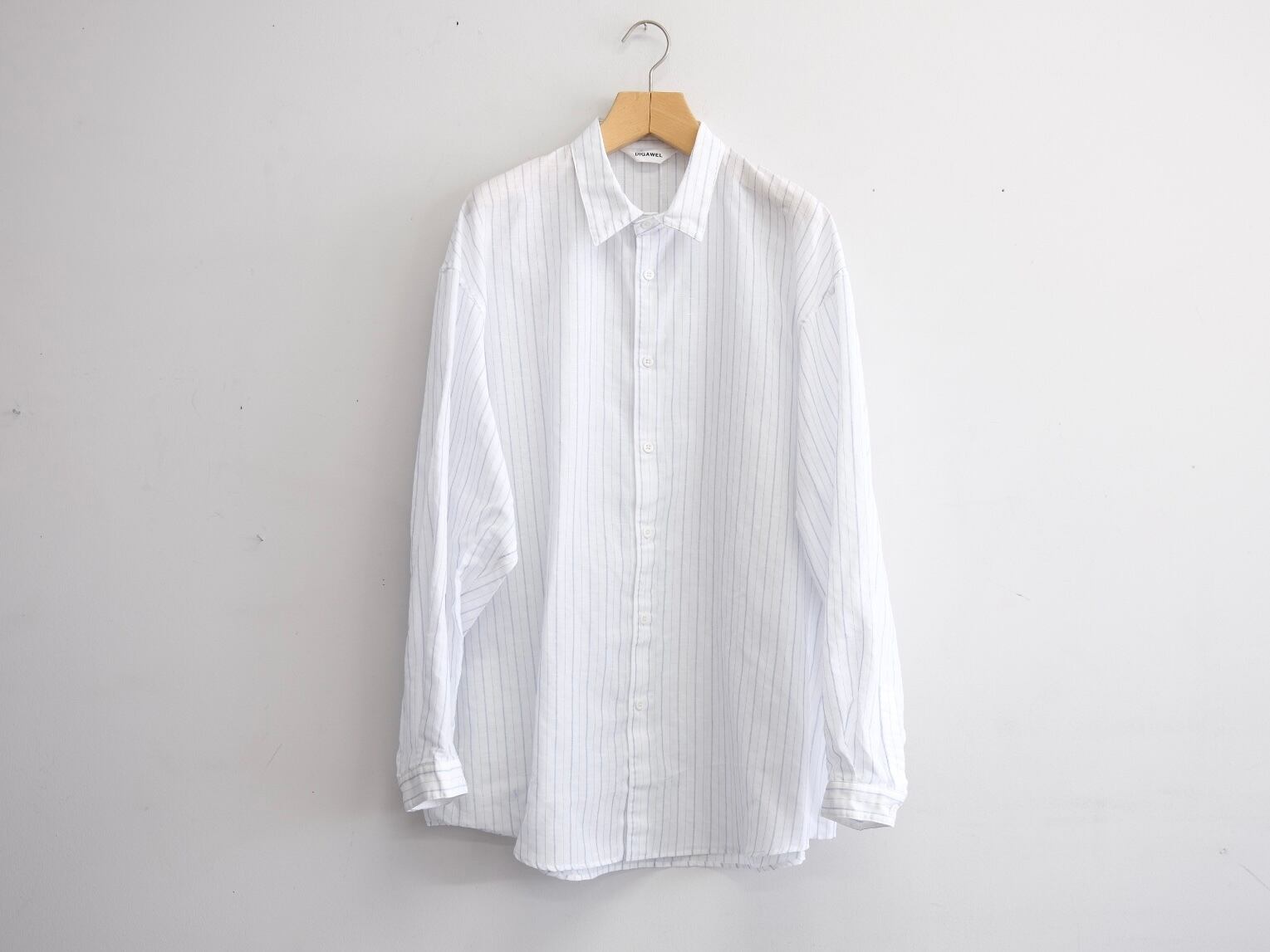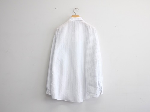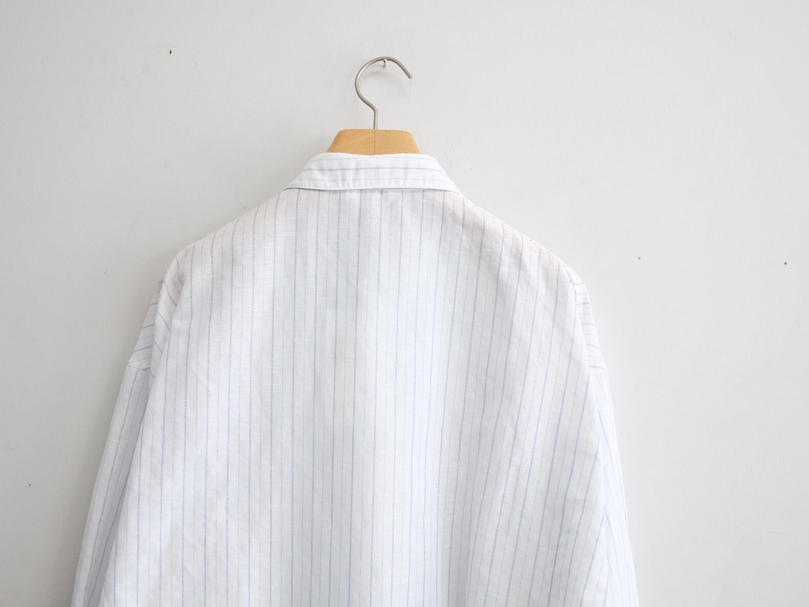 DWAA034 Quality Cotton45%,Linen55% Color Blue Size 1 Price ¥25000(+tax) 定番オーバーサイズドシャツコットンリネンストライプ。製品洗い加工を入れることで自然なパッカリングに見えるよう設定しています。 製品加工の為、若干の個体差があります。 Size 1 肩幅59cm身幅69cm着丈81cm袖丈57cm