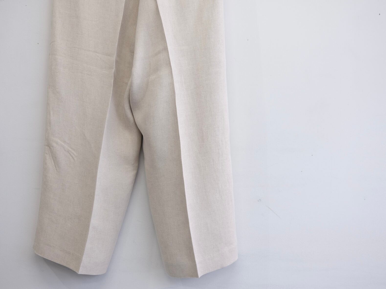 REVERBERATEでは定番になるスラックストラウザーズ。かなりゆとりのあるシルエット。ベルト内側のテープによってウエストのサイズが調整できる仕様。膝上まで100% キュプラの裏地付き。生地はタテ糸・ヨコ糸ともに細番手を使用した高密度100% リネン。