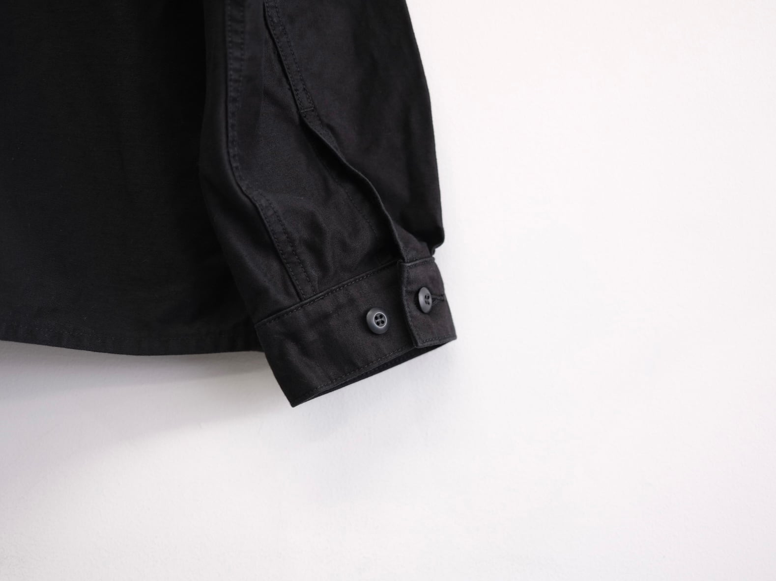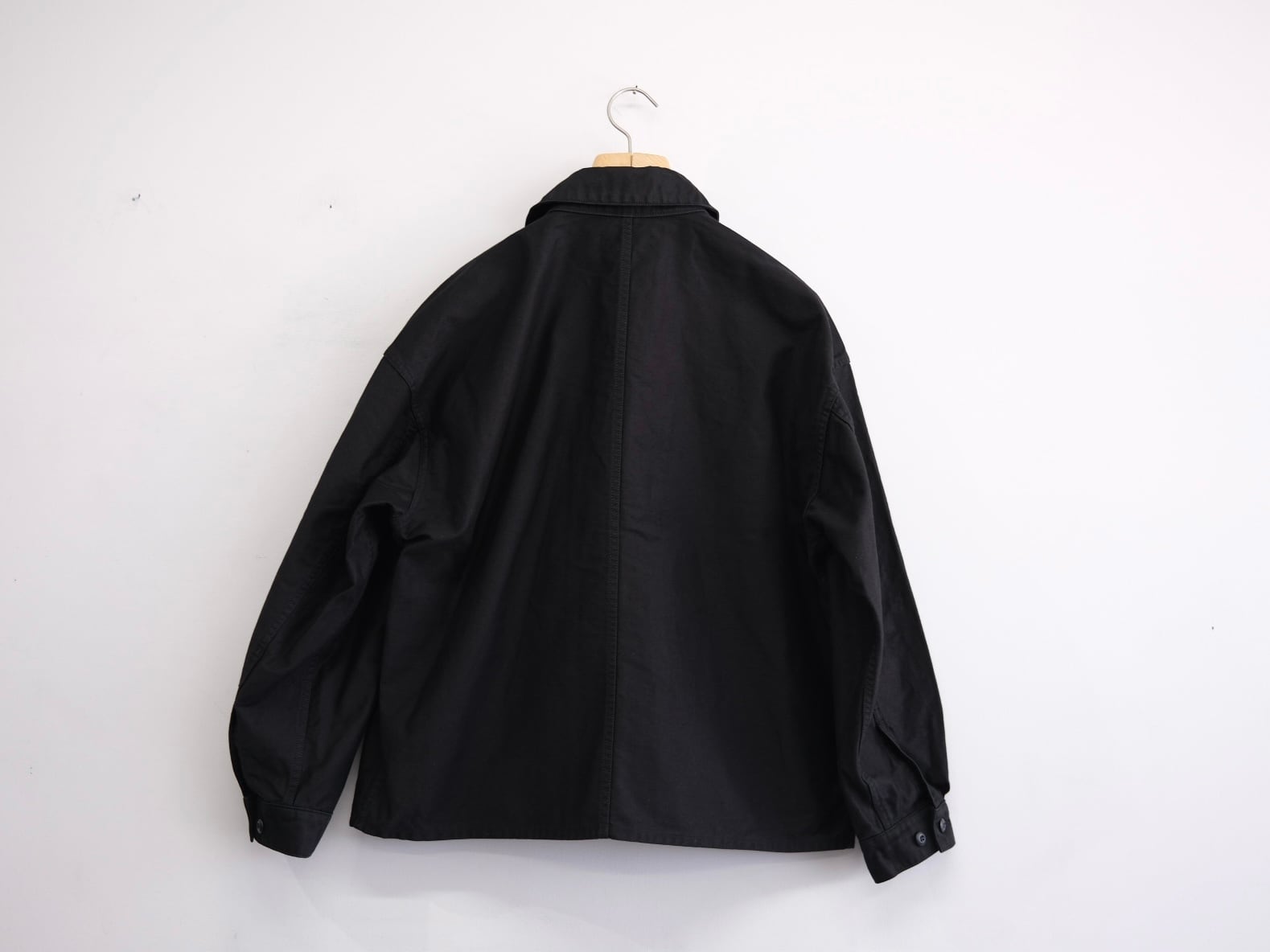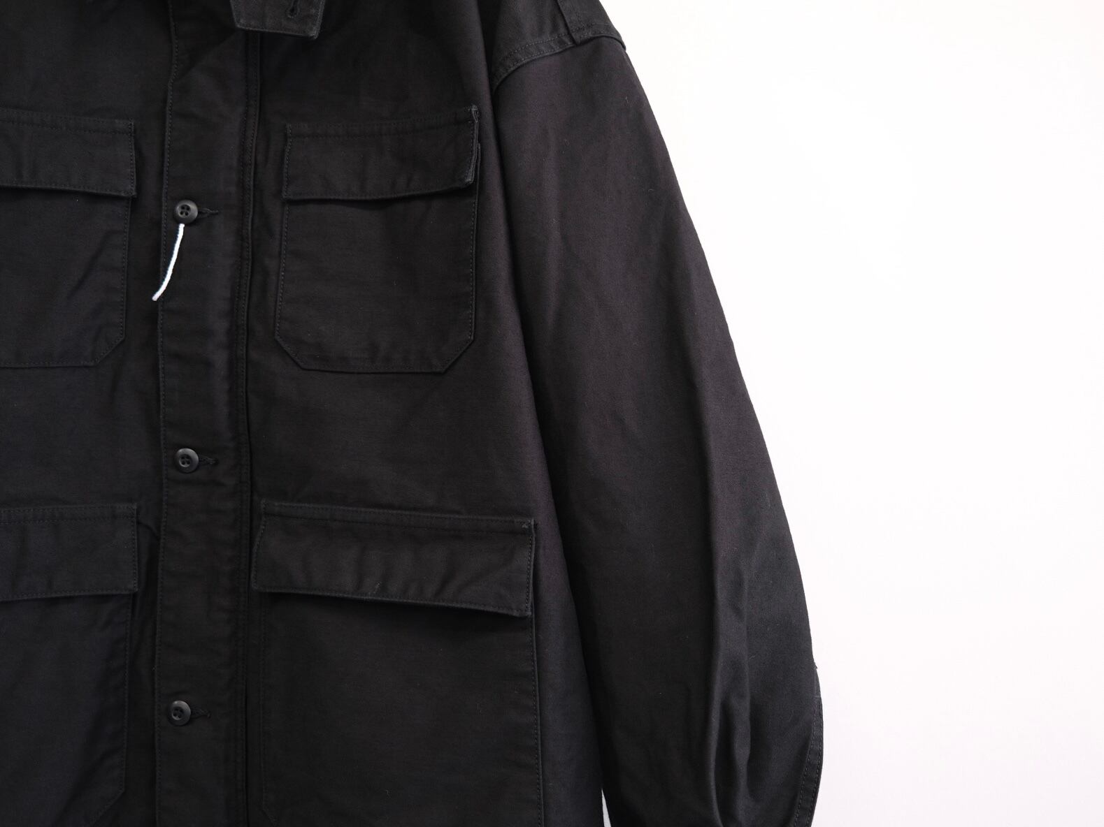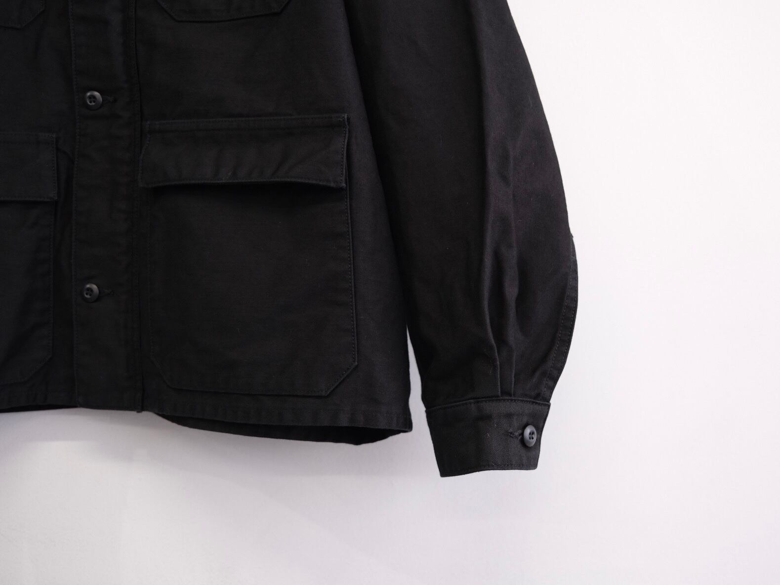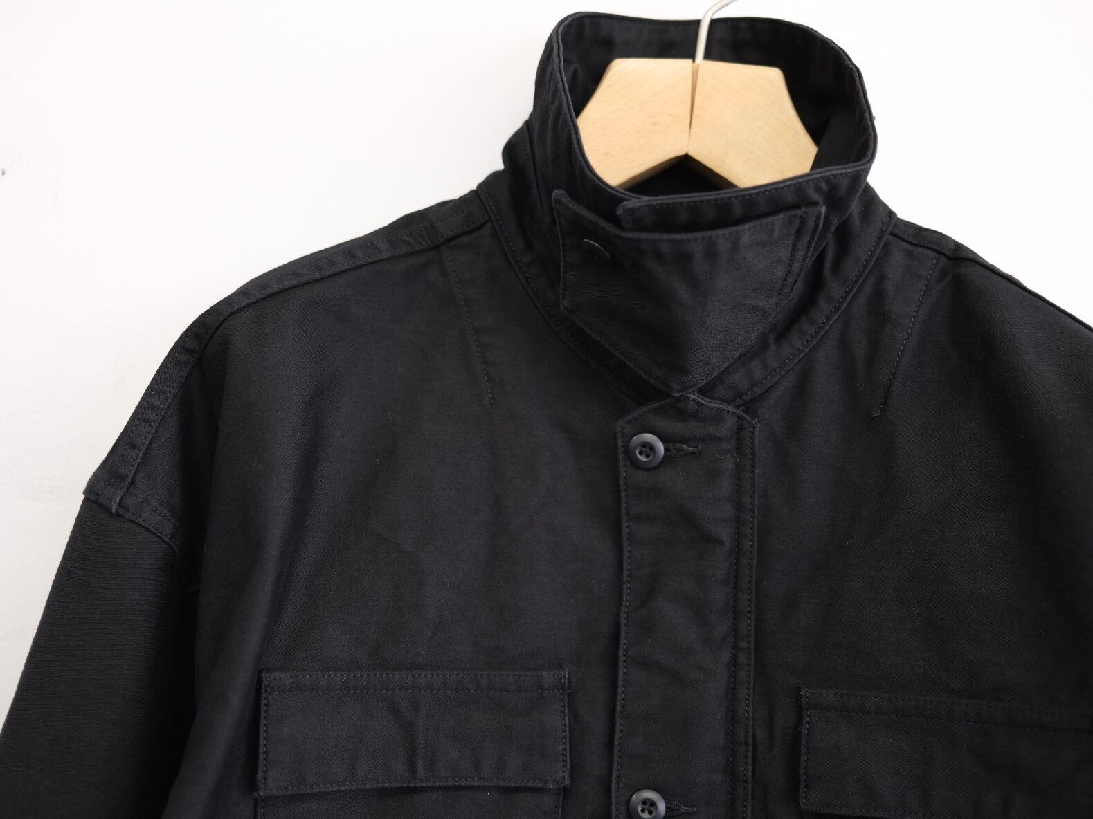 REVERBERATE が提案するファティーグジャケット。製品はバイオウォッシュ加工を施し、ダブルジップで上下開閉可能。ボックスシルエットながら、コンパクトな印象。襟を立て、襟裏のストラップで止めて着用可能。全て巻縫い仕上げを採用し、タフな仕上がりになっている。