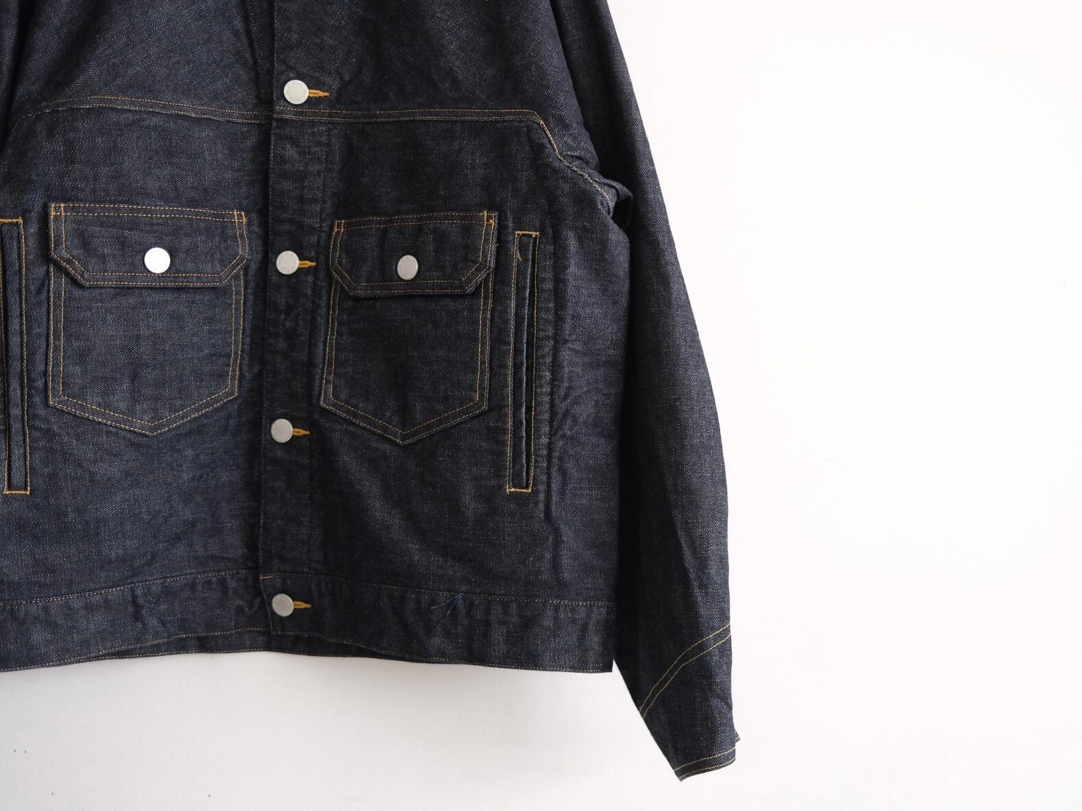 縫い目を無くす事でデニムジャケット特有の肩周りの固さがなくなり生地本来の柔軟さを楽しめます。