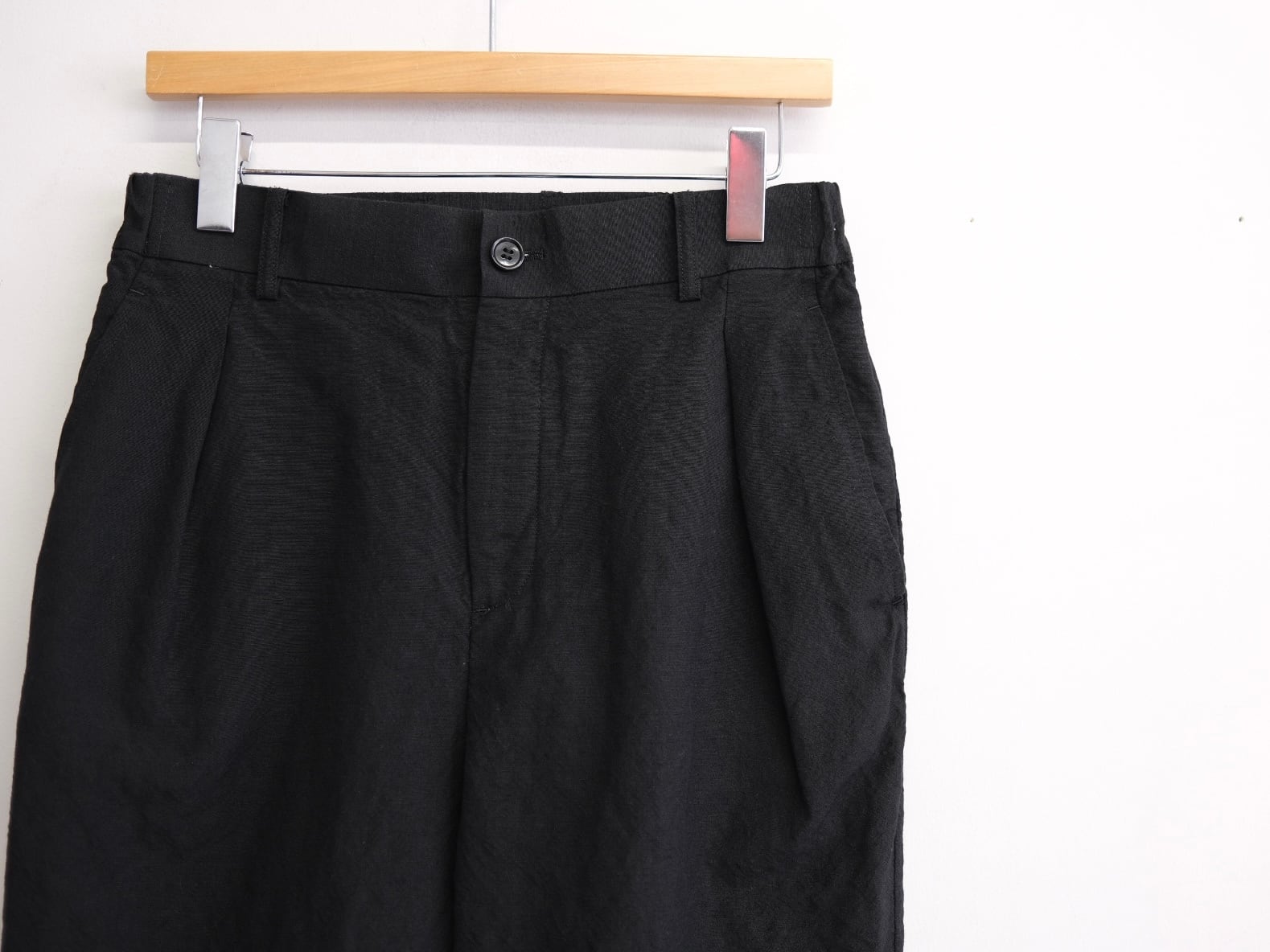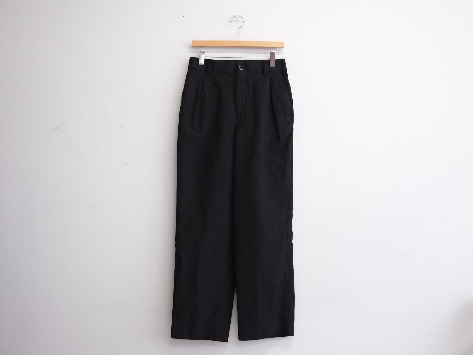 DWAA025 Quality wool 50% linen50% lining:cupra47% cotton 53% Color Black Size 2 Price ¥35000(+tax) ここ数シーズン続けているインタックパンツです。 26SSでは新たな試みとしてウールリネン素材を使用し、製品洗い加工を施しました。