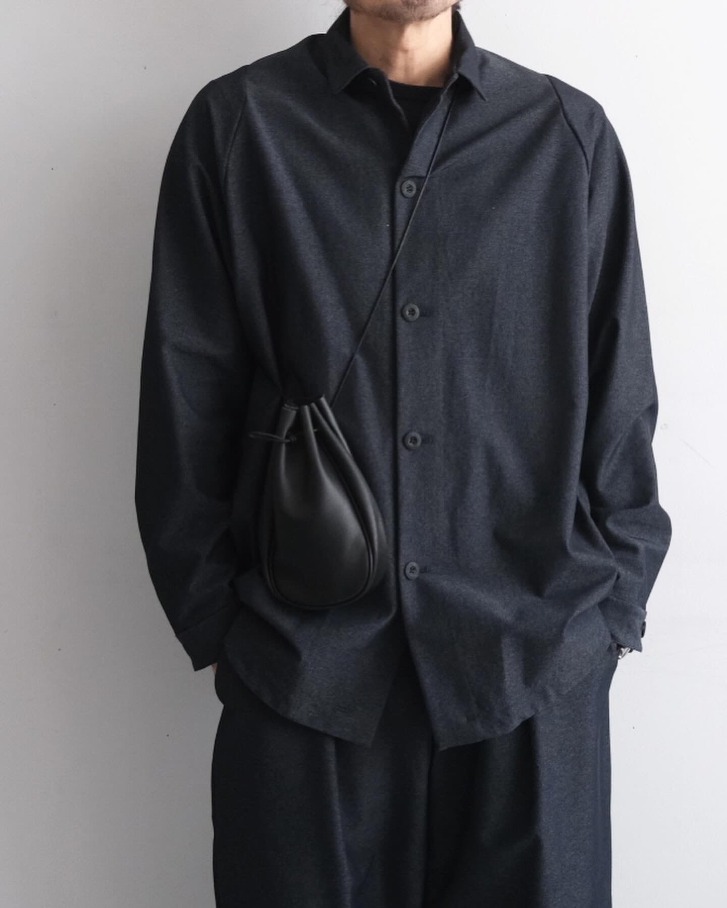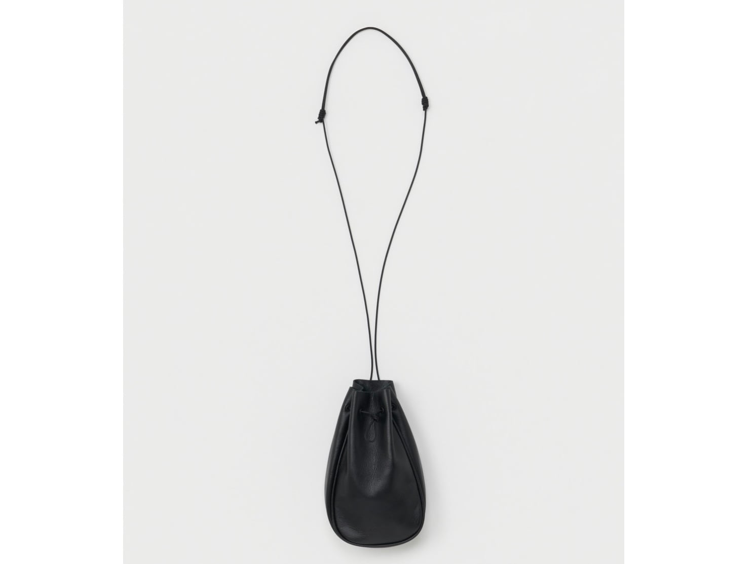 Color Black Quality cow leather/acrylic cord Size W12 × H20 × D4cm ストラップ: 190 cm ※調整可 ドローストリング開閉 Price ¥20000+tax