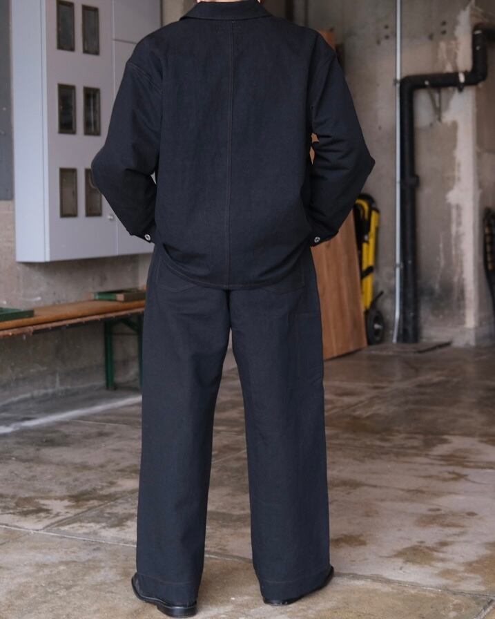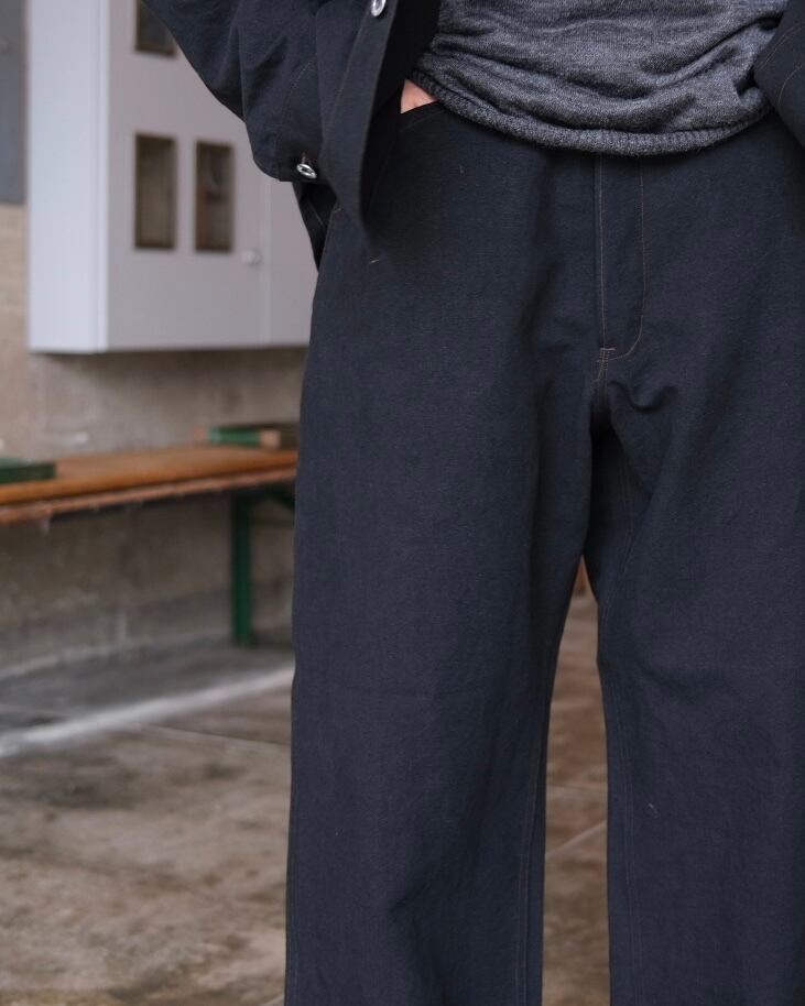 古い時代のワイドストレート型のワークパンツをブランドらしく仕上げたトラウザーズ。
