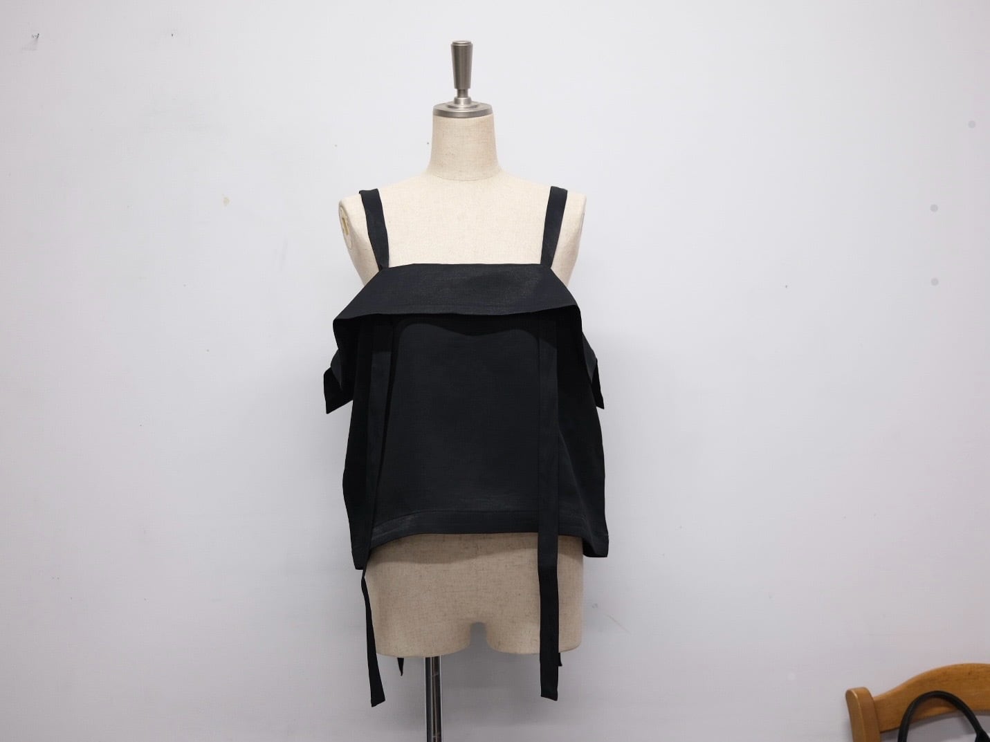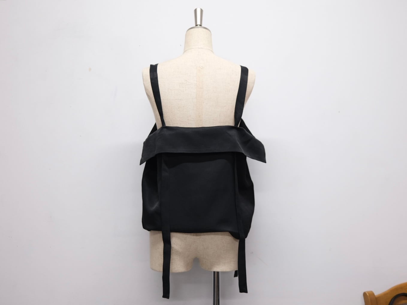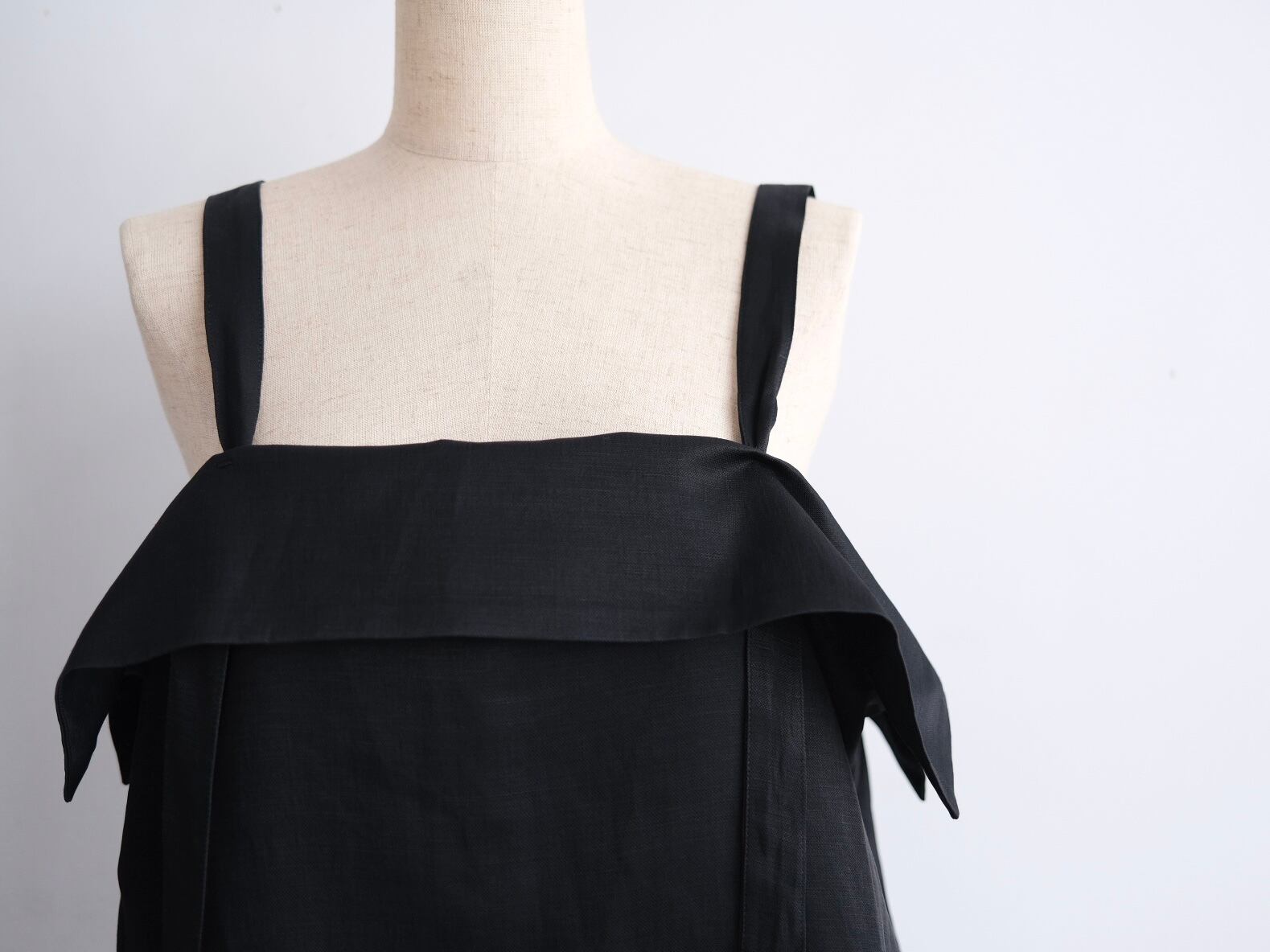 Color Black Quality Cupra63%, Linen 37% Size 34 身幅52cm着丈35cm ストラップ調節可能 Price ¥28000+tax キュプラ×リネンの生地を使用したビブス。 紐の長さ調節でスカートのように着用も可能です。 共生地でパンツもございます。