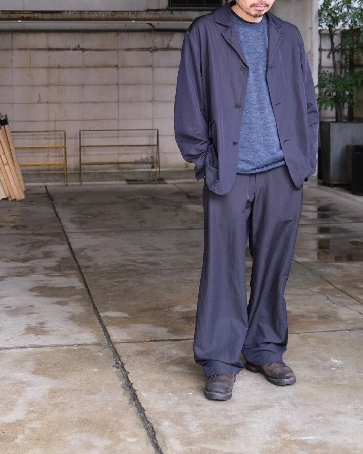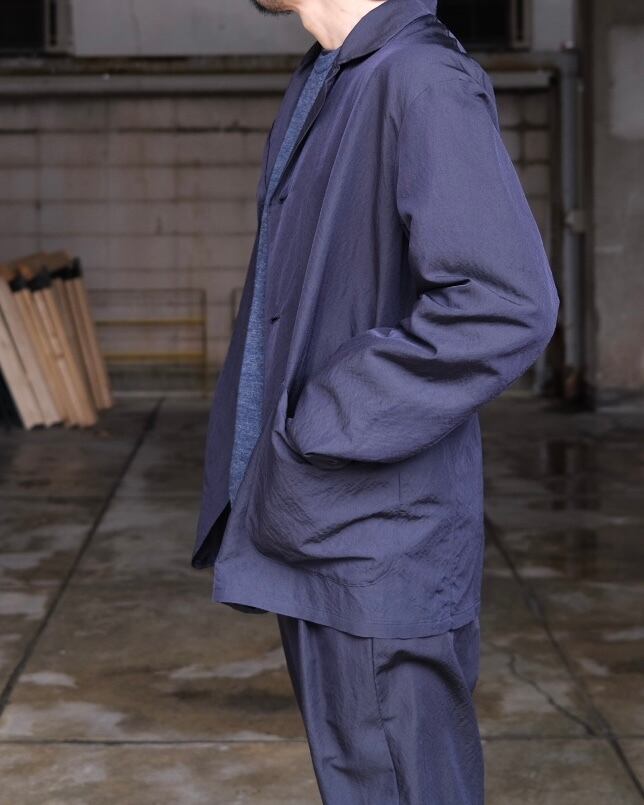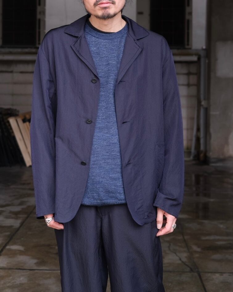 ビンテージのワークジャケットをベースに単衣仕立てで仕上げたジャケット。剥ぎ取られたかの様なラペル仕様など、長年着込まれたような粗野な雰囲気を加えながら、製品洗いをかけることで表情のある佇まいとカーディンガンのよう軽やかな印象に仕上げています。