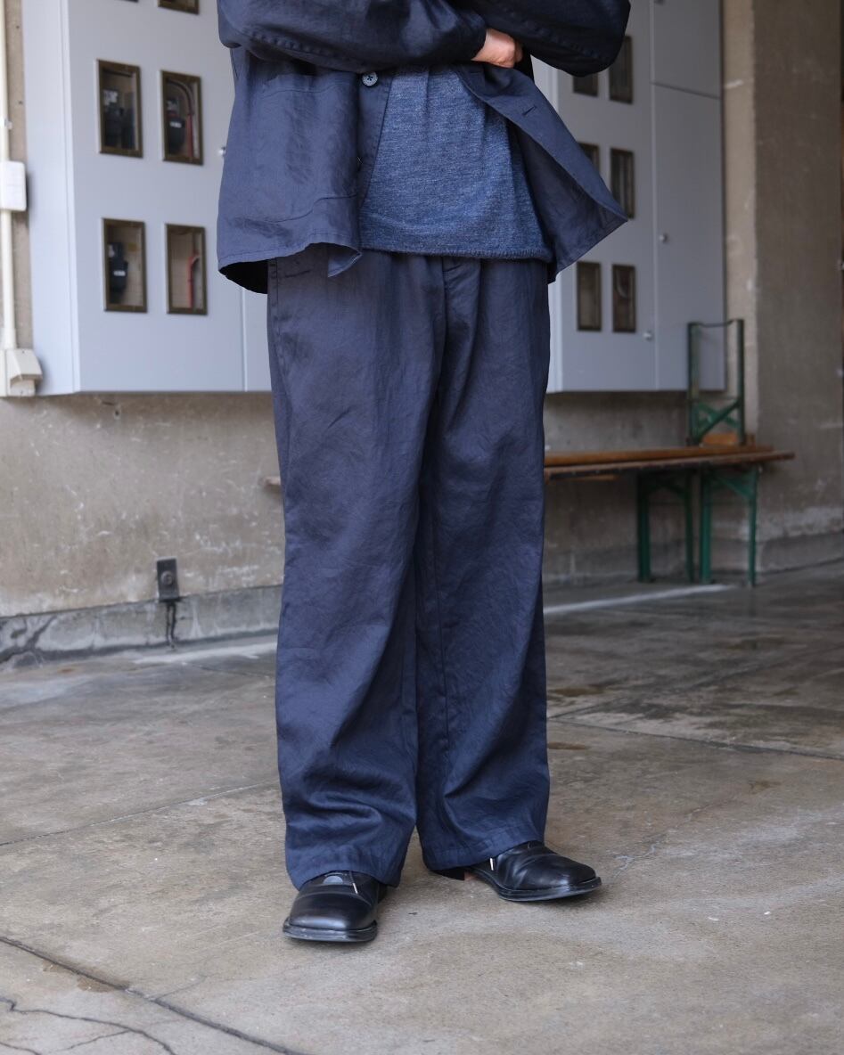 オーバーパンツをイメージした形で、コットンツイルに特殊な加工をしてハリを出した生地を使用し、製品染で古着のような風合い。