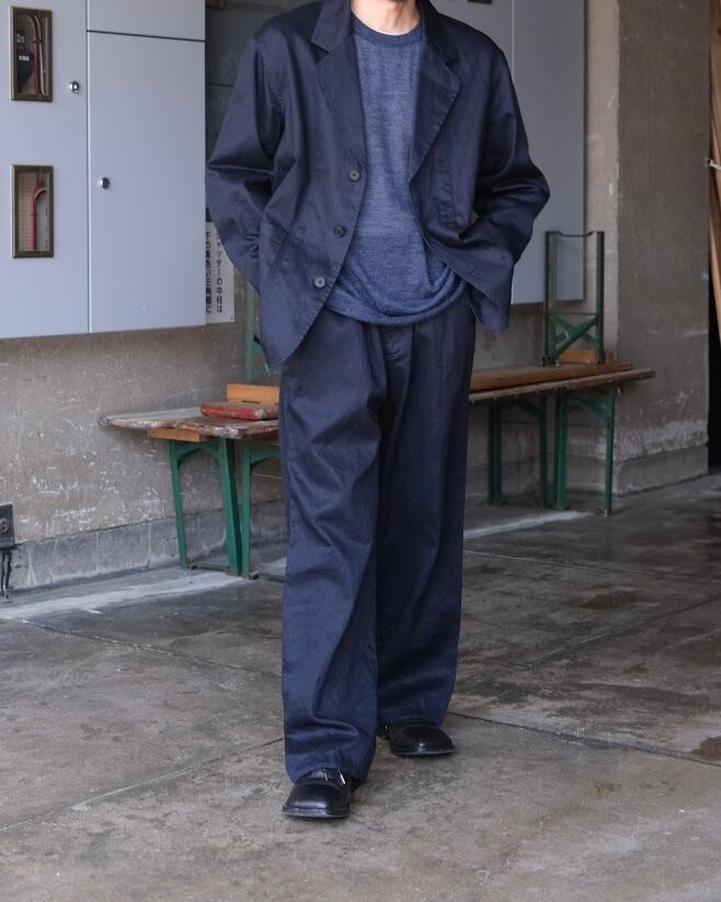 光沢感ある仕上がりになり、着用していくごとに風合いが良くなっていきます。同素材でジャケットの展開もあるのでセットアップで着用して頂ます。