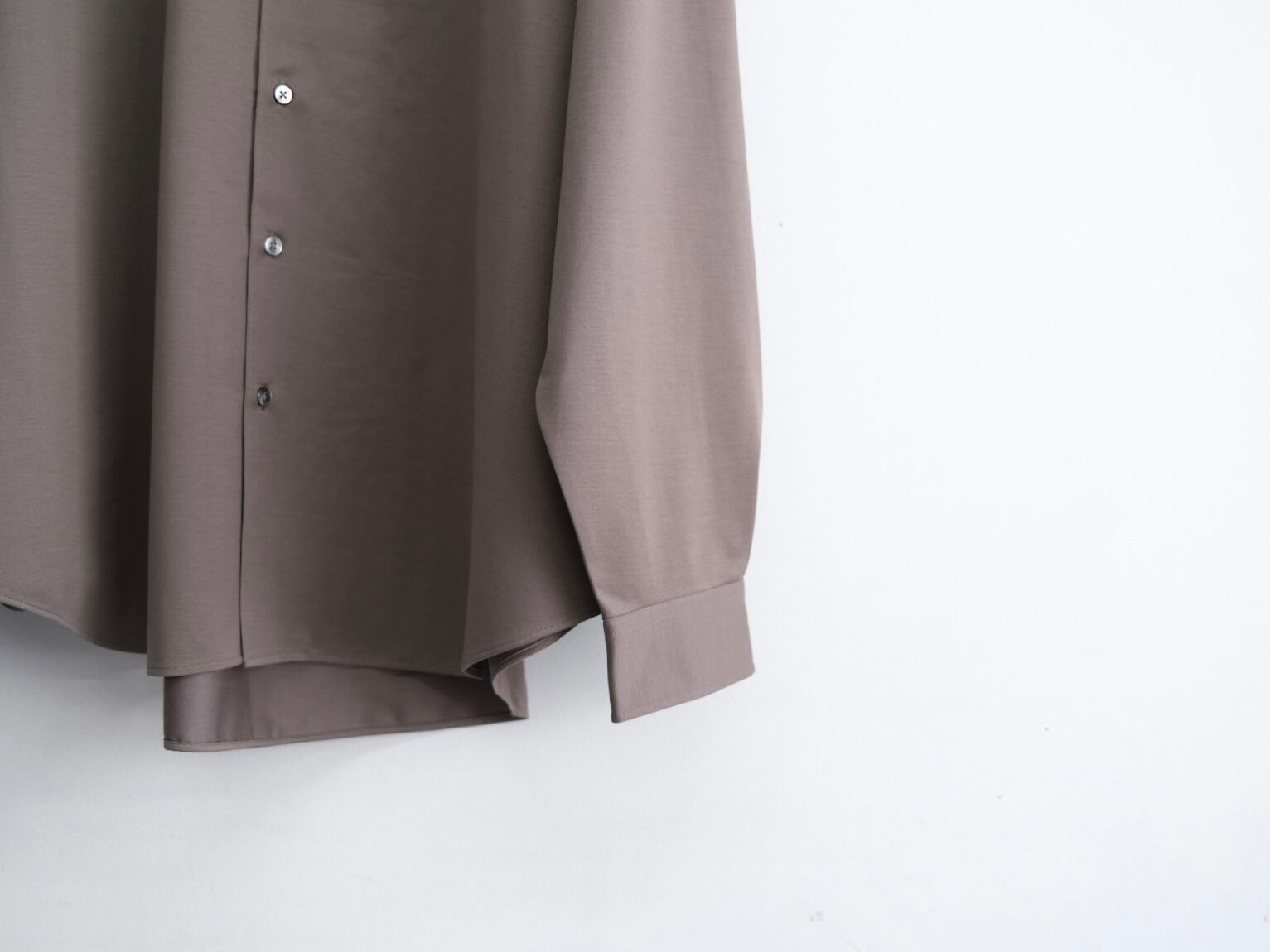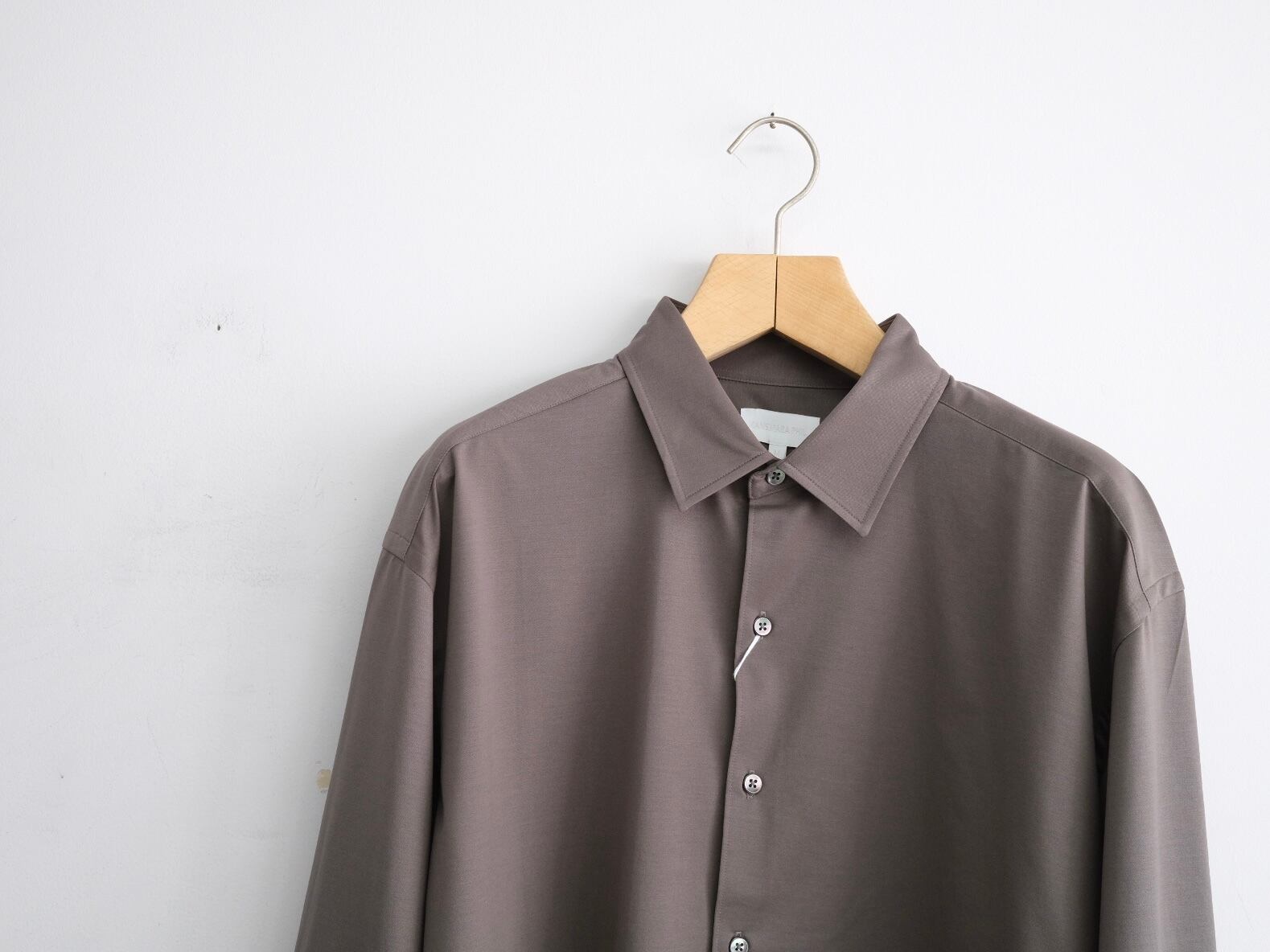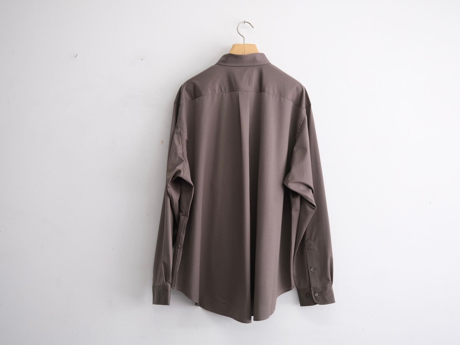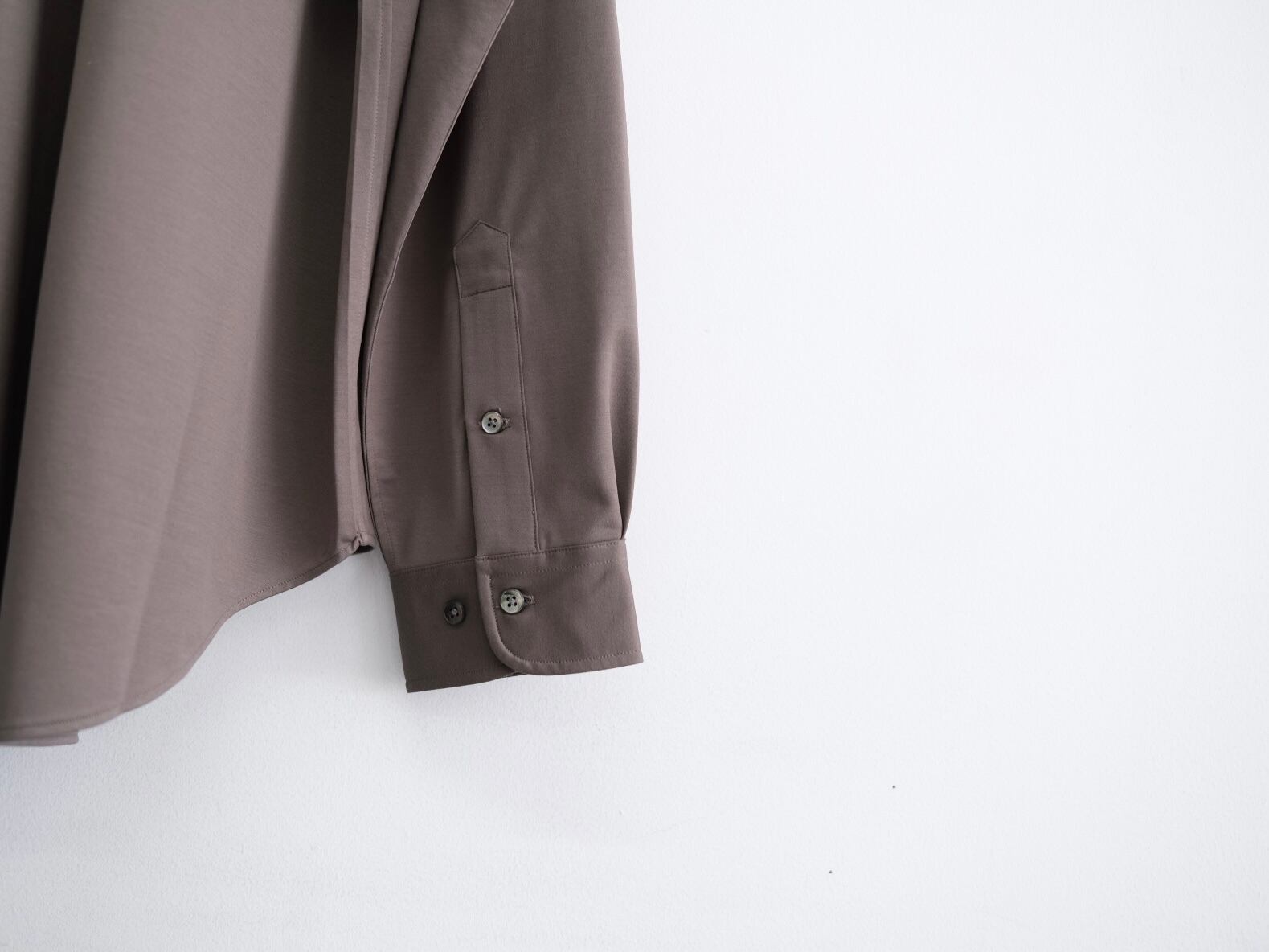atmosphere” 空気を纏うという名前の通り、 ゆったりとしたシルエット、素材の落ち感がわかりやすい定番シルエットのシャツです。46Gという、スーパーハイゲージで、タイプライターという織物の高密度平織組織を実現。 ストレッチ性が高く一度着ると止められない着心地、そして、着用時のしわなどの形態変化も少なく、イージーケア性も高い。 ハリ感、光沢感、イージーケアを持ち併せた我々にしかできないニュースタンダードシャツ地。