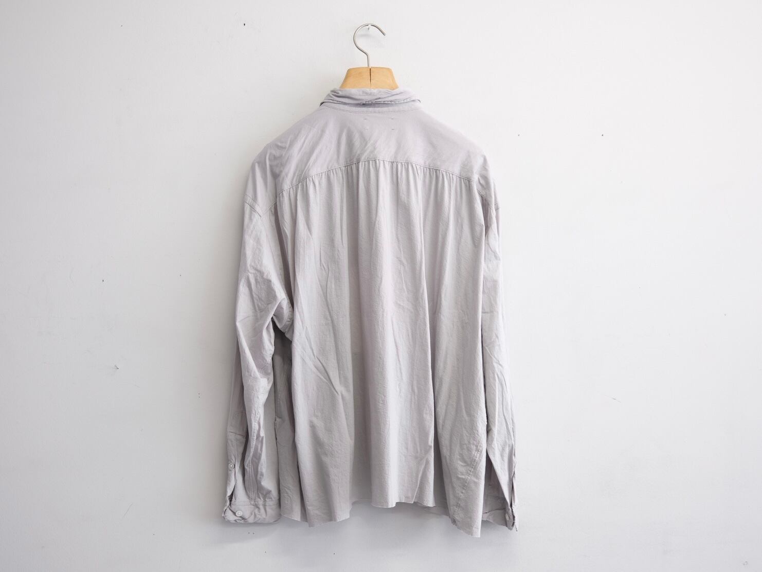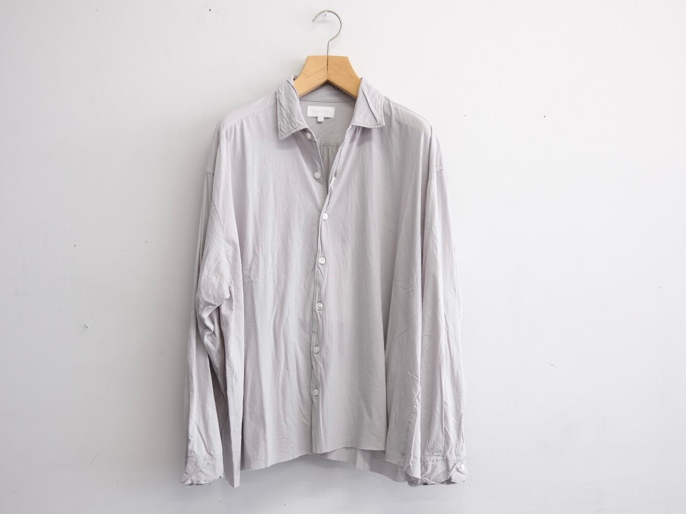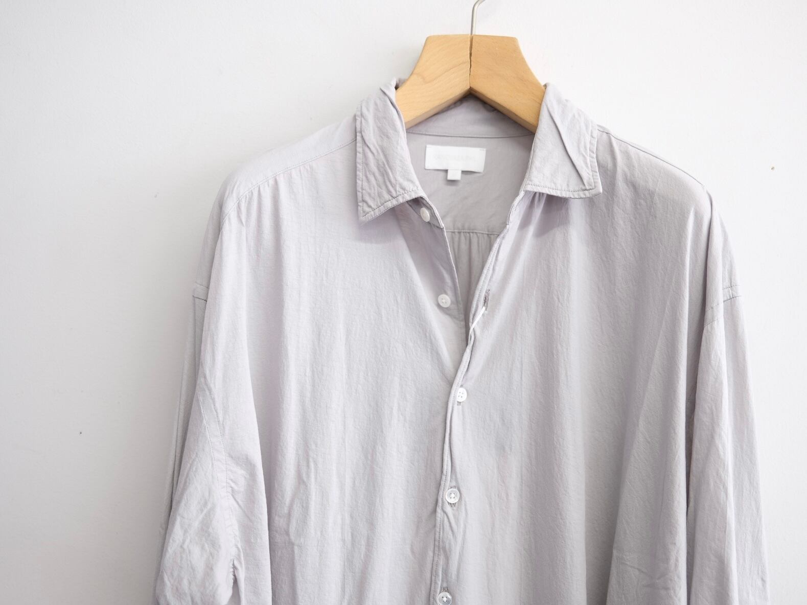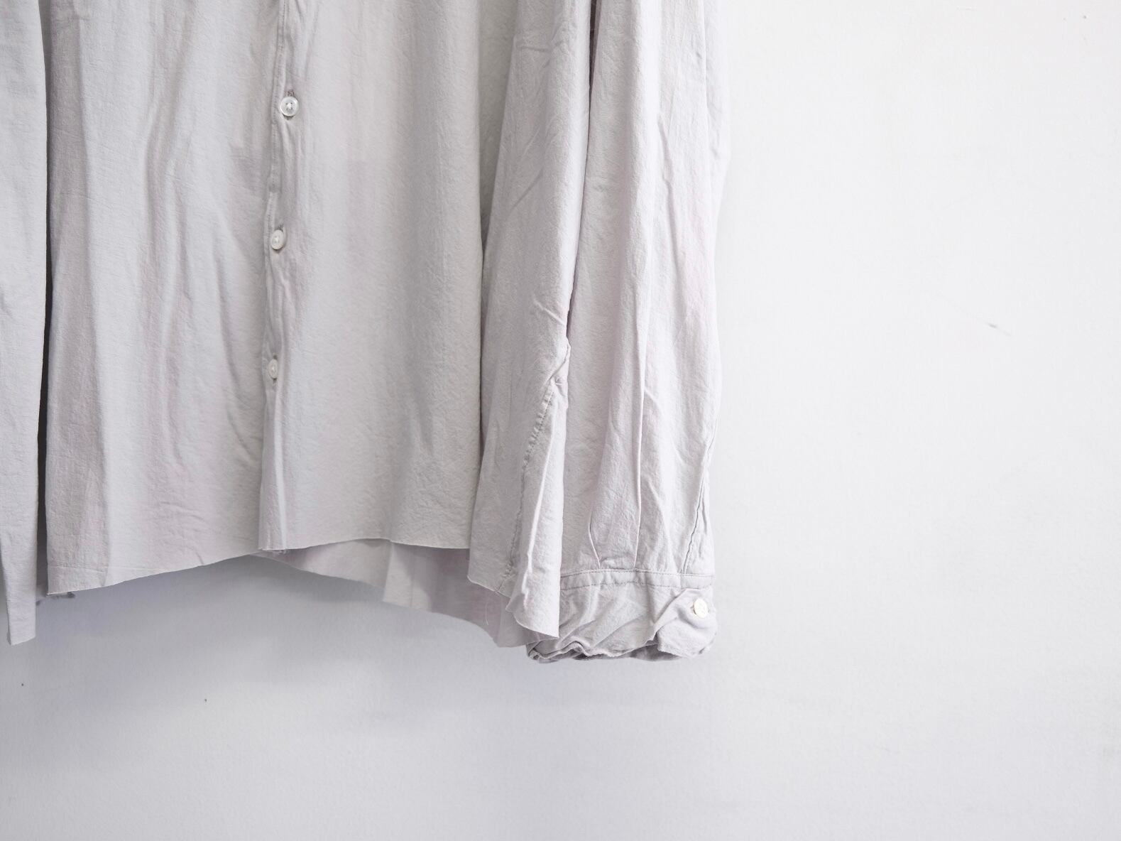 釦裏にブランド刻印を施しております。身幅をしっかりとったボックスシルエットが特徴。着用時のドレープなどは他にない雰囲気のシャツとなります。またサイズの切りっぱなし、芯地を極力仕様しないことで、生地の風合いのみでシルエットを構築しております。