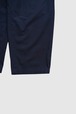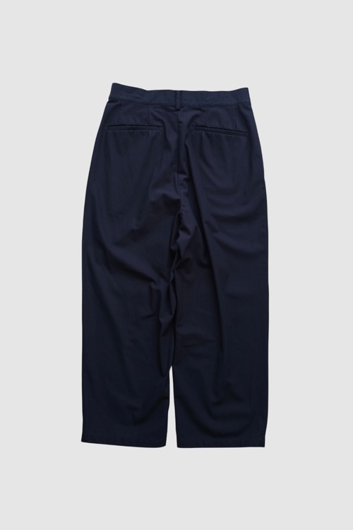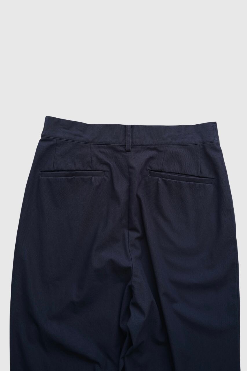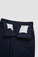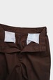 前パンツにダーツを入れ、ポケットのラインにダーツを隠し、面を作ることによりヒップのボリュームを出しています。フロント開き用釦が見えるよう股下もかなり深く設定しています。