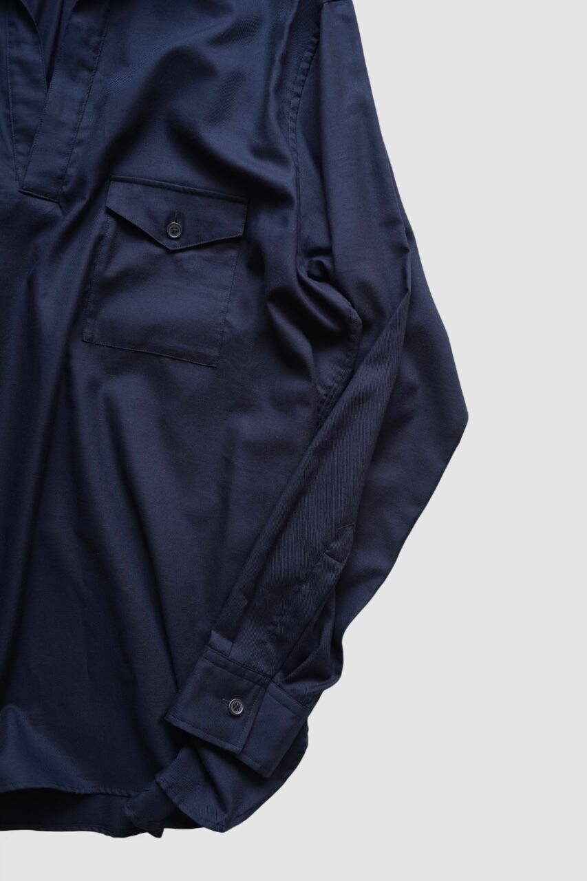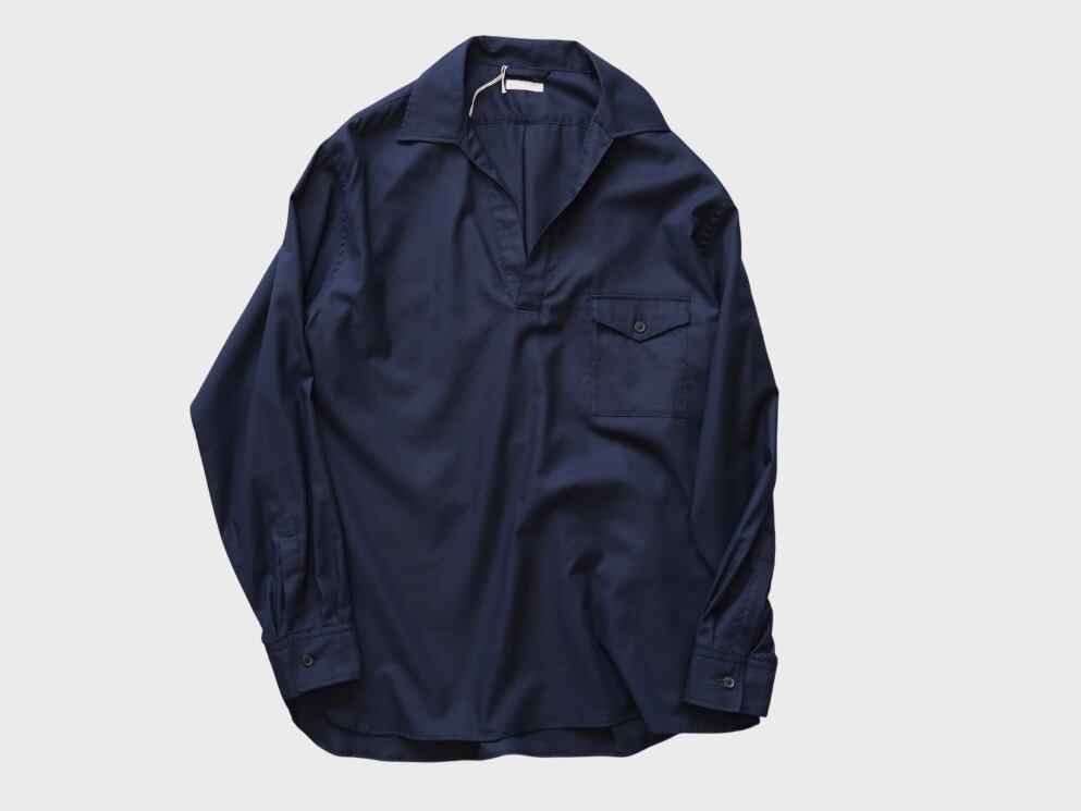 フロントの程よい開きが心地良いスキッパーシャツ。空気を孕んだようなゆったりとした分量感は袖通しも良く、洗い晒しで着こなしたい心地の良い一枚。