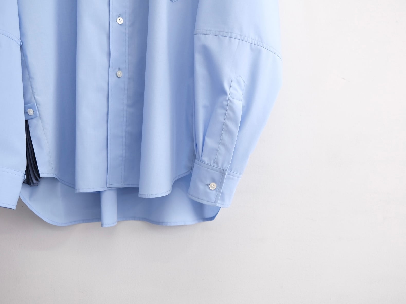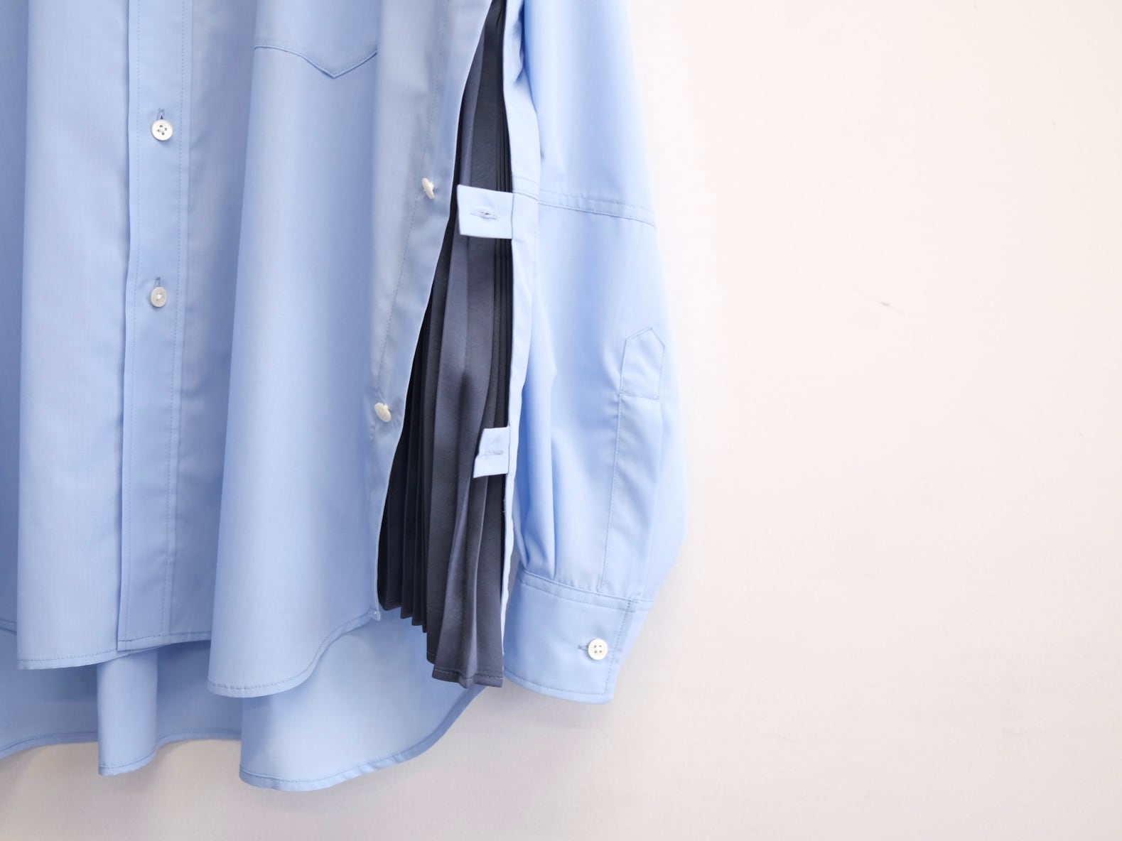 身頃両サイドのサイドプリーツが特徴で素材にはポリエステルサテンにパーマネントプリーツを施し、洗濯や着用によっての型崩れがなく、イージーケアもポイントです。