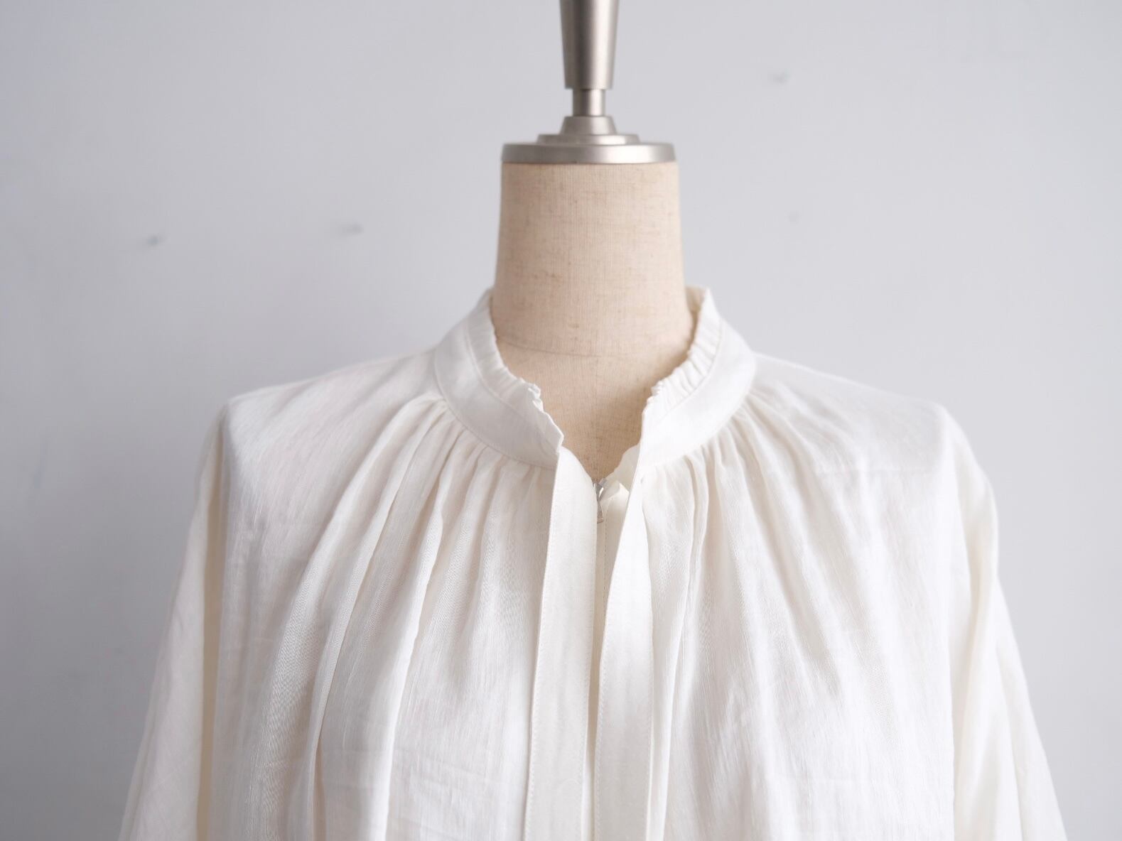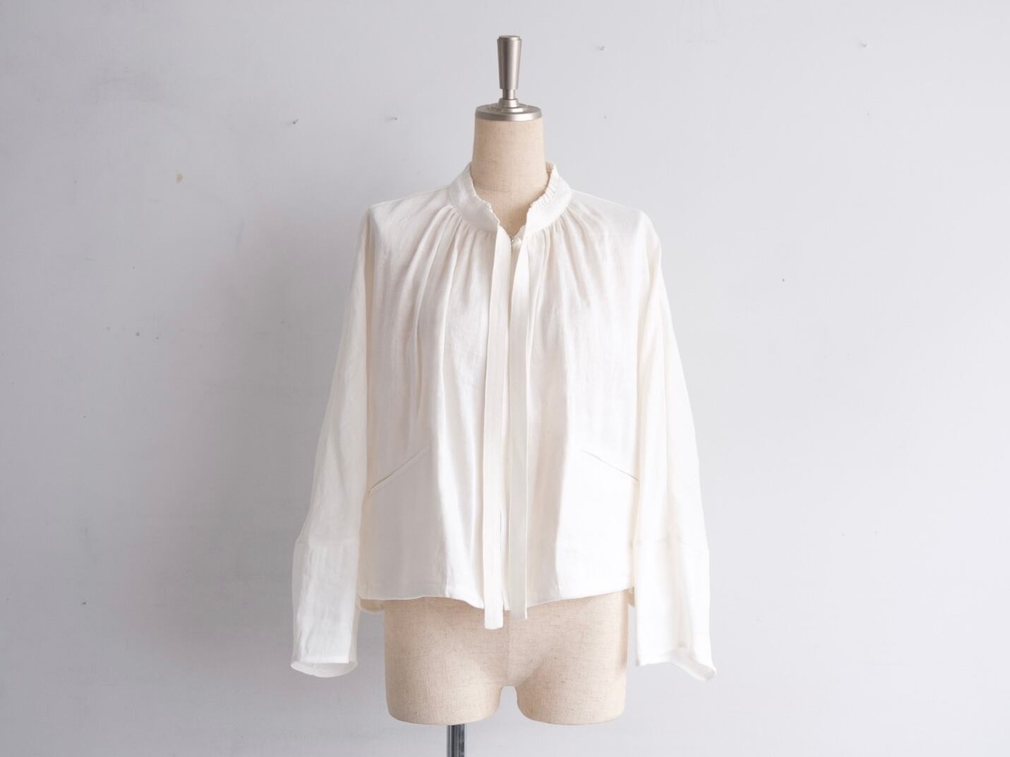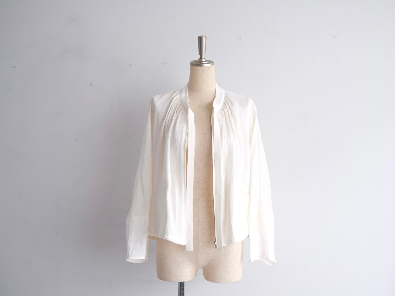 Color White Size One Quality Linen 72% Cupra 28% Price ¥67000+tax 襟のフリルが特徴のジップブルゾン。 フリルについたタイは垂らしても結んでも。 ジップはエクセラを採用しております。