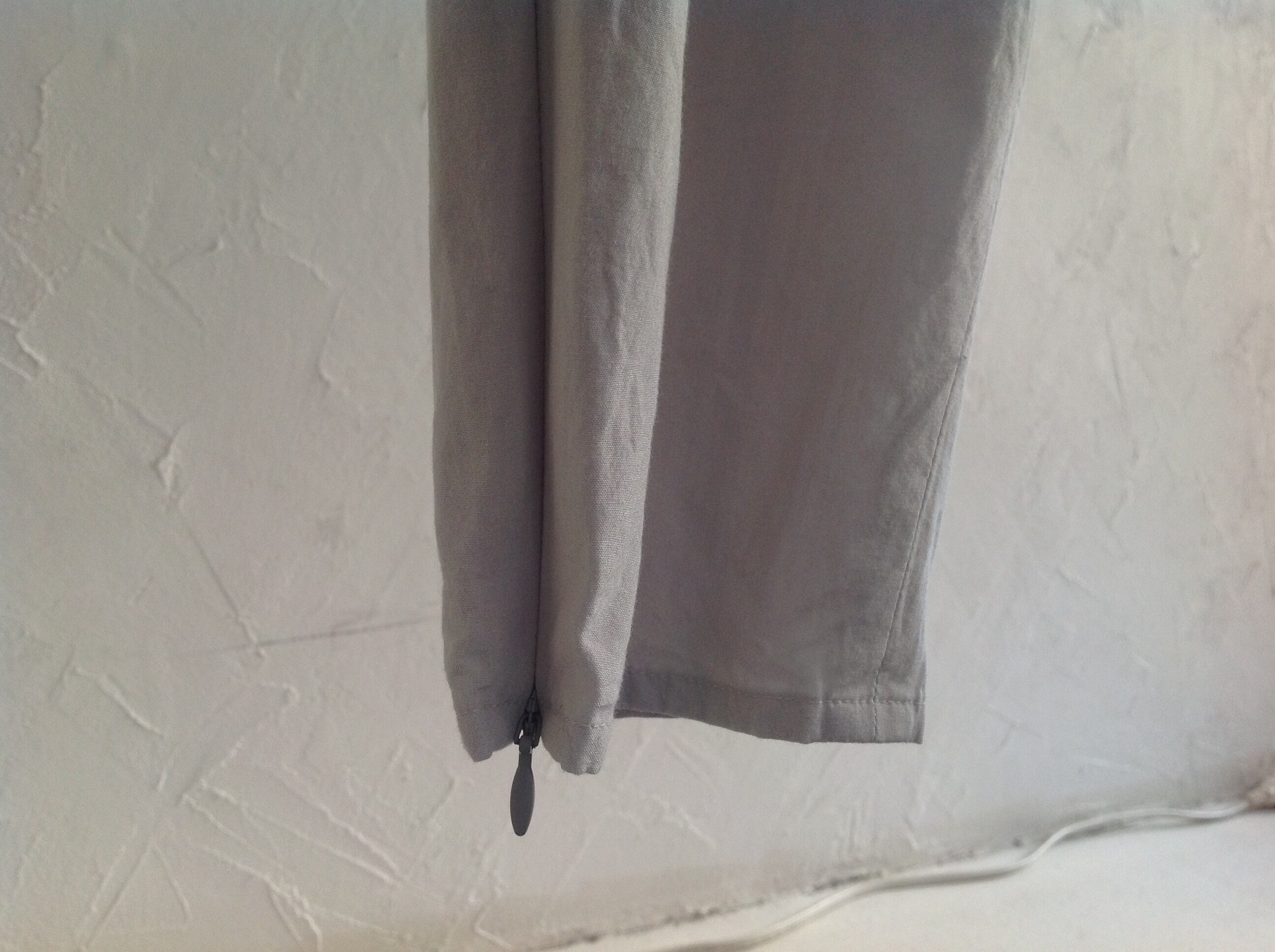 シルエットは2タック入りで裾にかけてキツめにテーパードをかけた細身の美しいシルエットを形成し、また着脱面と合わせるシューズとのバランス面を考慮して裾にはコンシールファスナーで開閉できるようにしてあります。