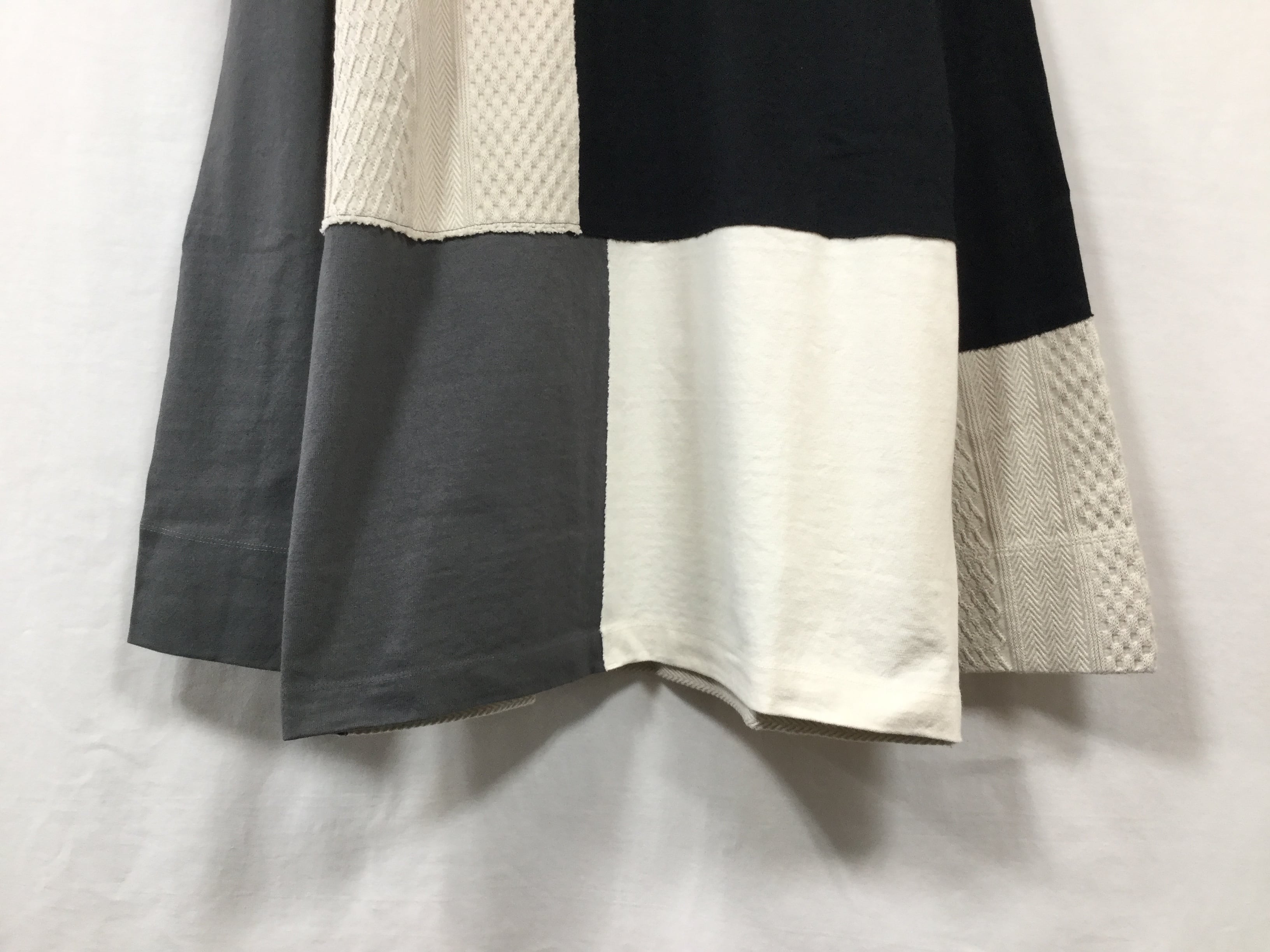 太番手の糸を使いハイゲージで編み立てられたマルチジャガードをポイントに、3色の生地で構成したニットとカットソーの中間的なニットカットソー。断ち切りになった生地端がアクセントになっている。