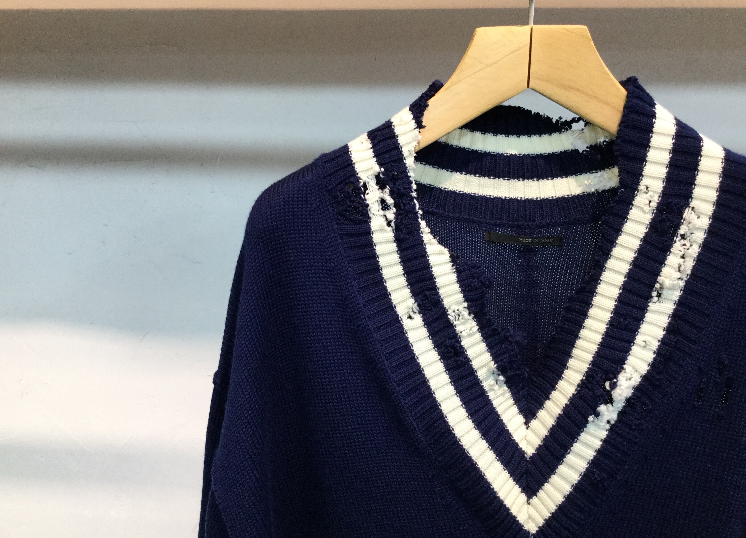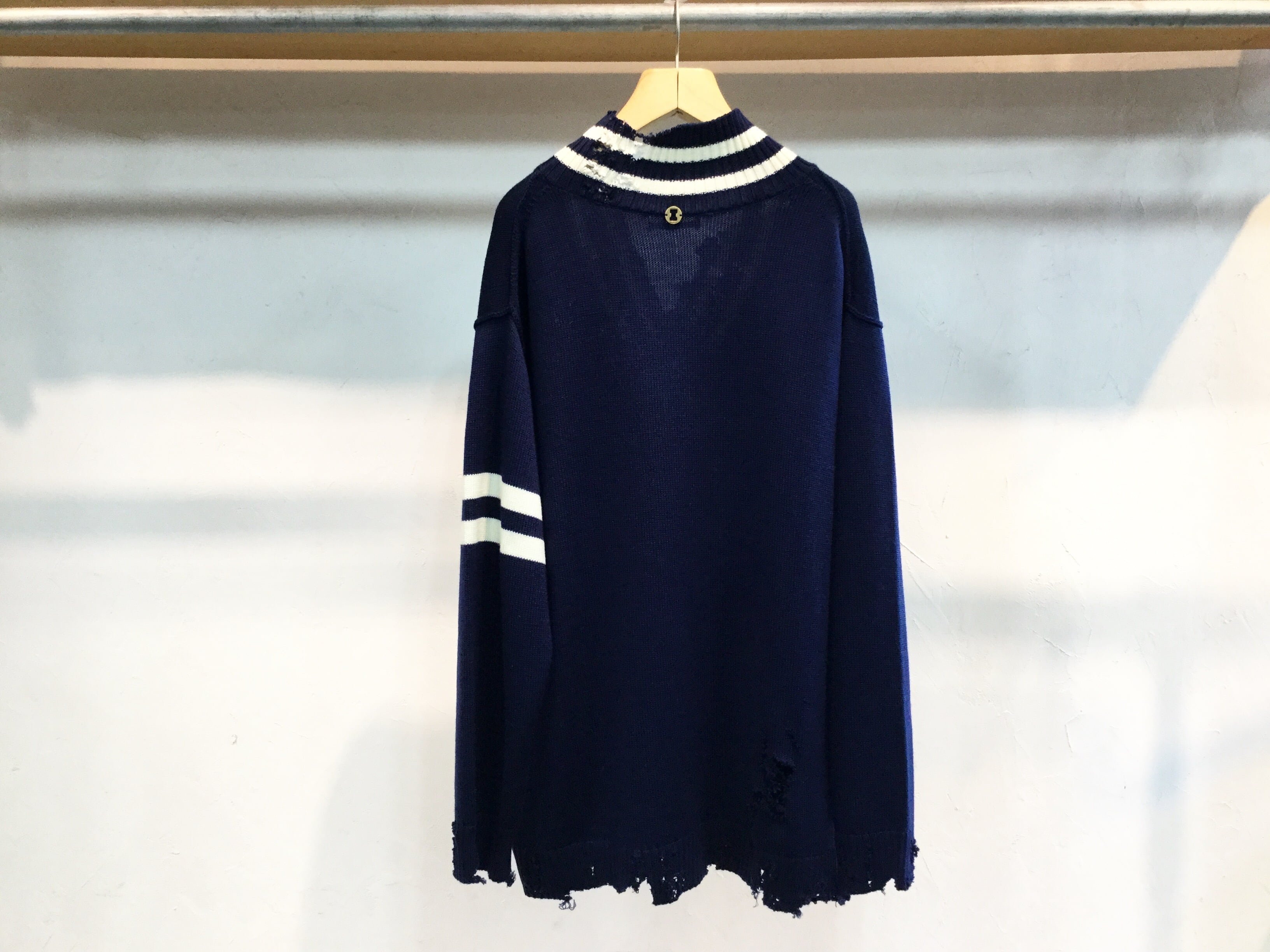 レタードニットというトラディショナルなデザインにダメージを施すというブランドのクリエイティブが感じられる一着です。