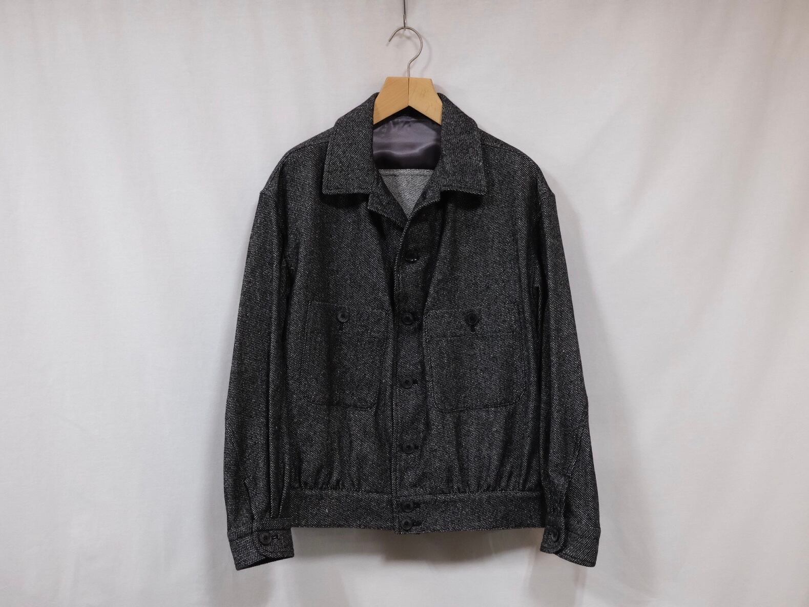デッドストックのウール綿生地を使用した50’sスタイルのSHIRT JKT。着丈65cm程のショート丈はGジャン感覚で羽織れます。冬はコートの中に忍ばせて着たい一着。大きめのポケットや裾のタック、釦仕様などホームレスらしい凝ったディテールもポイントです。