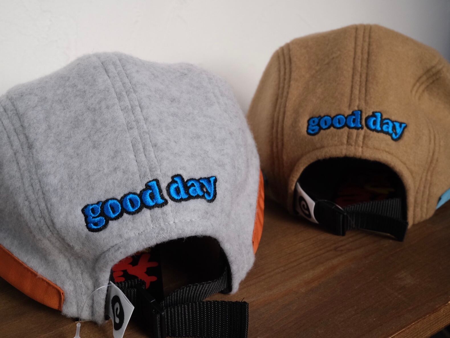 フロントのファスナー付きポケット、サイドのテープ使い、バックの”good day”刺繍とポップな仕上がり。