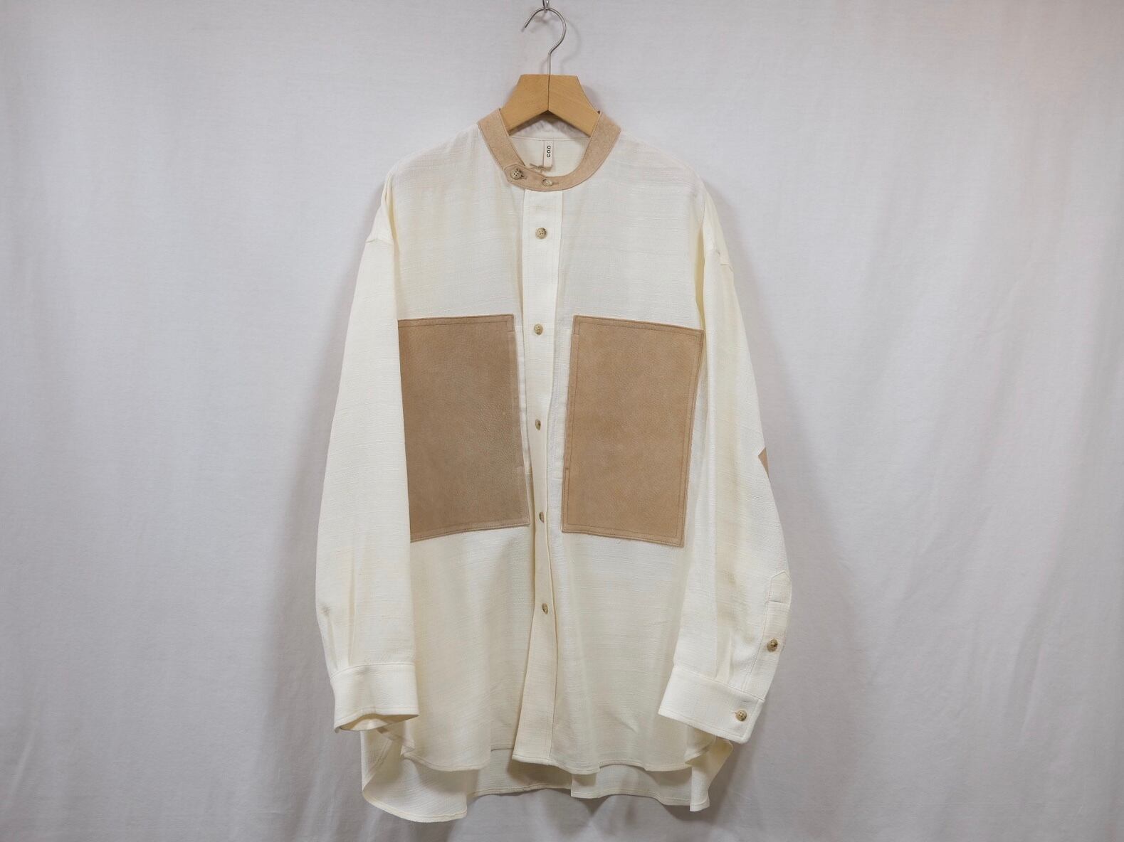 ローシルク×ピックスエードのバンドカラーシャツ。レザーは洗える加工を程しており、通常のレザーより水にへの耐久性があります。