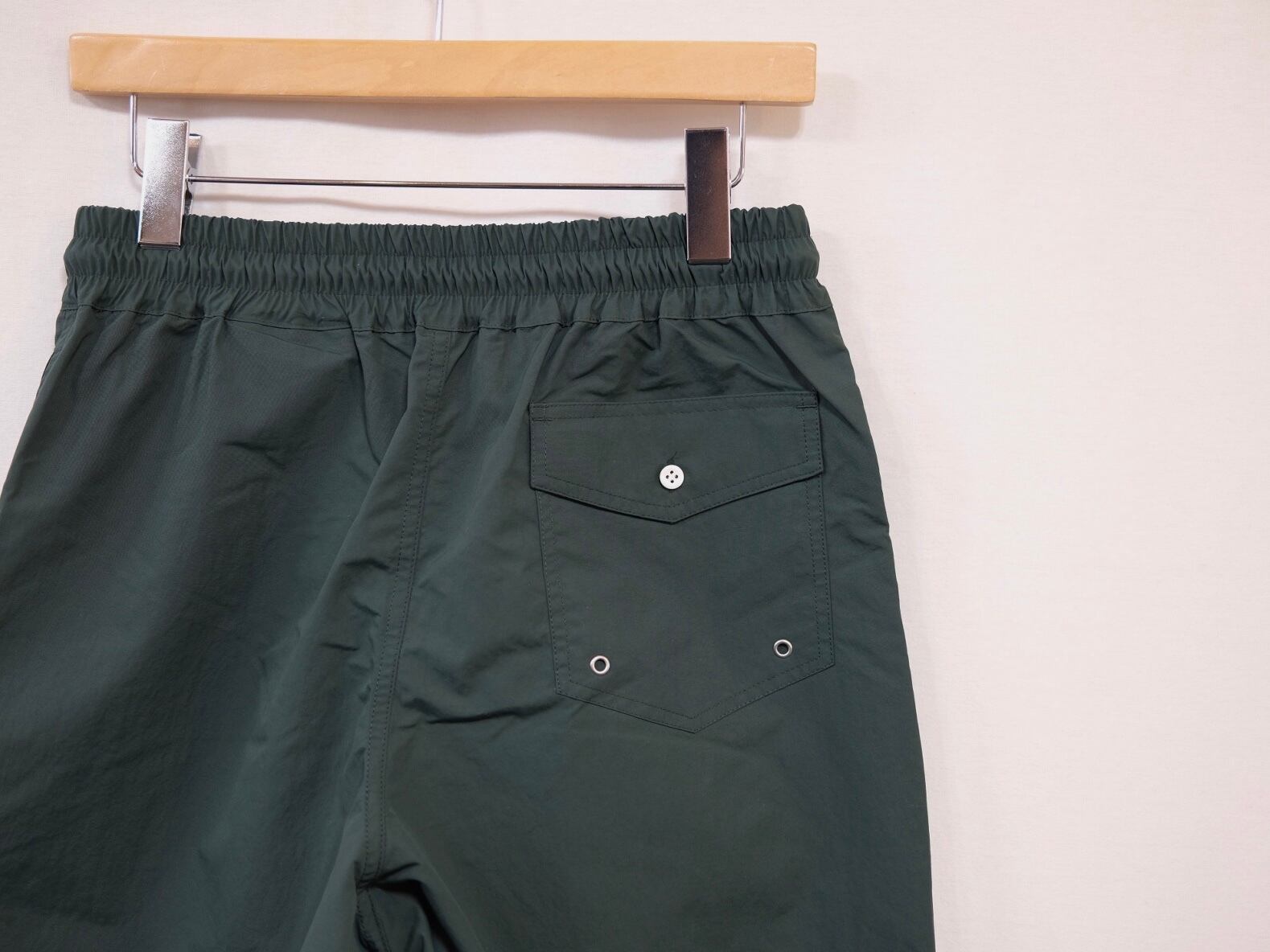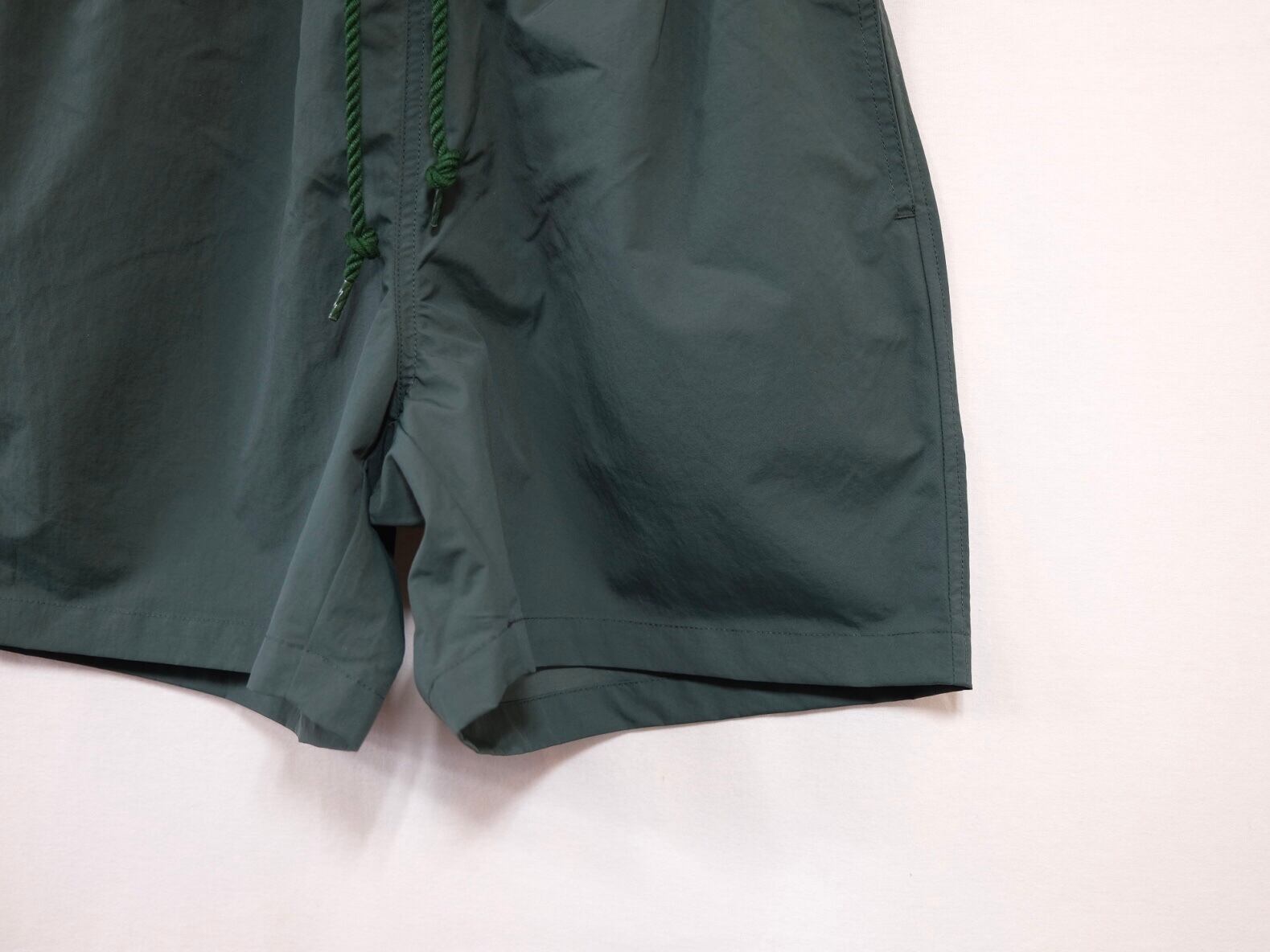 素材にナイロン100%、ポケット裏にはメッシュ地を使用しヒップポケットには水抜き穴が設けられていますので、ショートパンツとしては勿論、簡単なスイムウェアとしても使えるバギーショーツ。ウエストはゴム&ドローコードの仕様、丈が短めのコンパクトなフォルムはバランスが取り易く様々なスタイリングにすっと馴染みます。