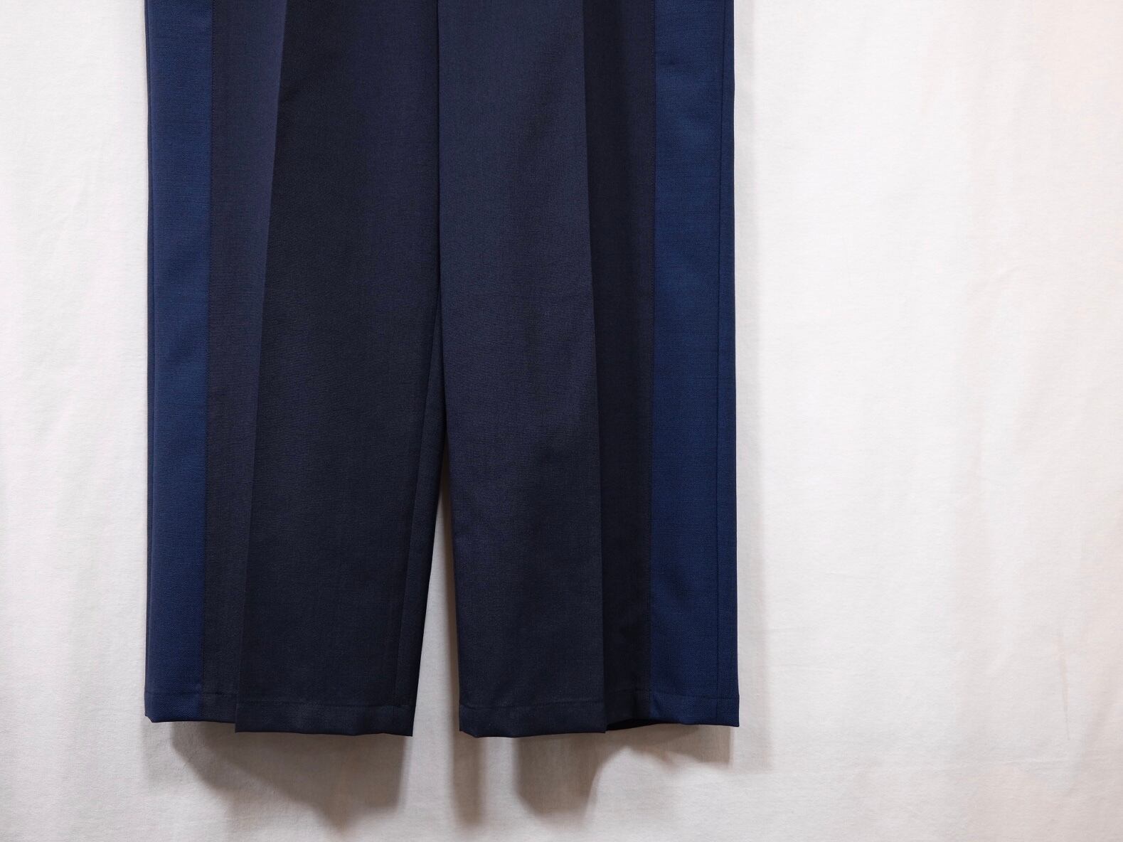 センタープレスの入った1タックパンツに切替線を入れ、素材違いの配色生地で構成したパンツです。