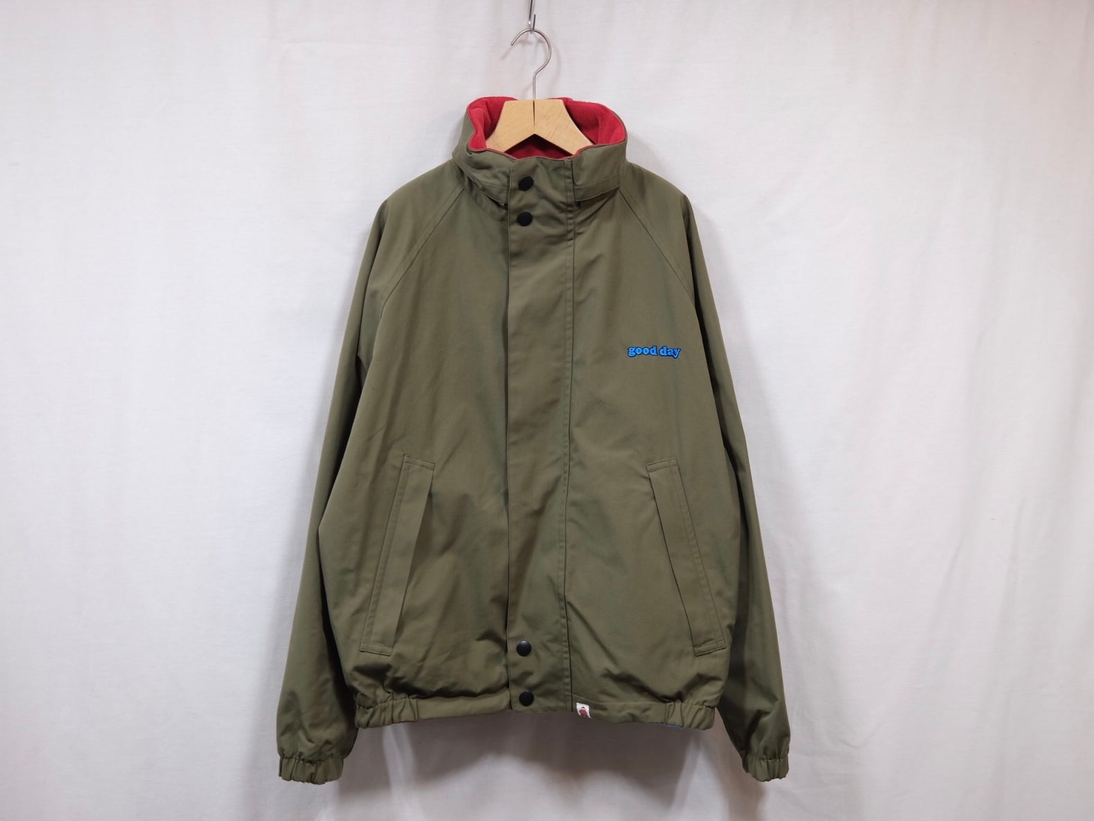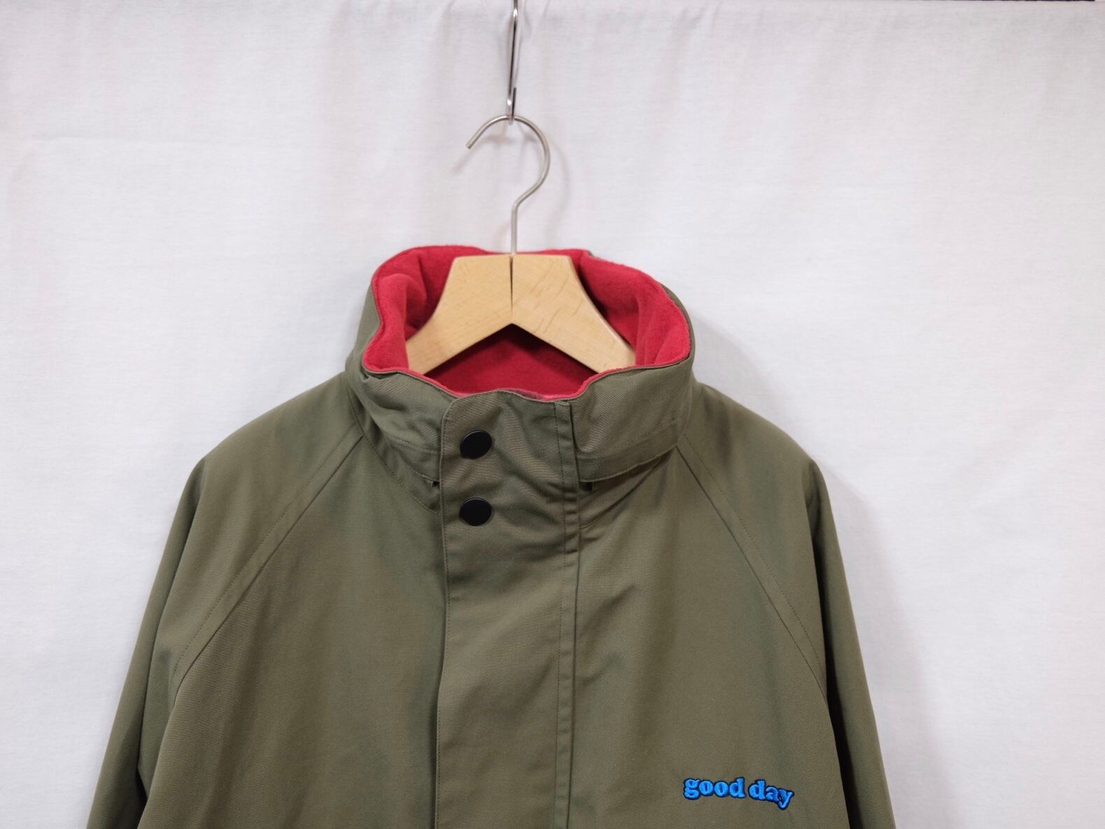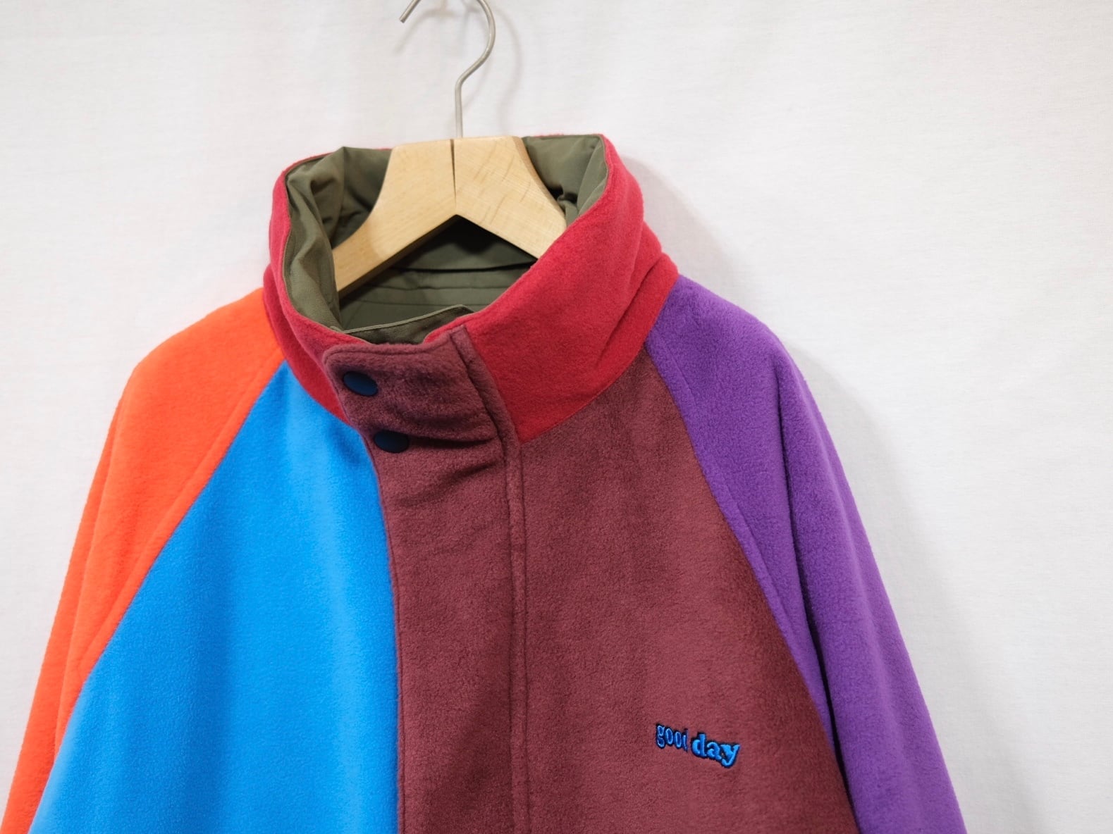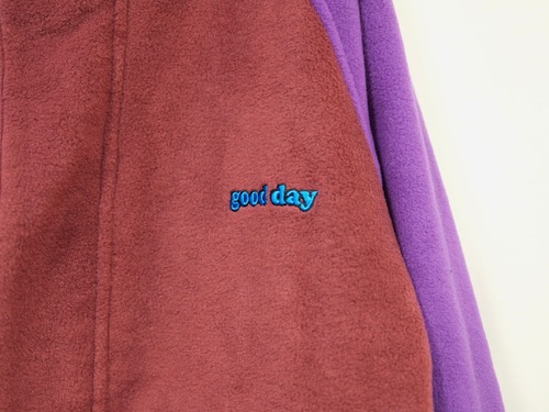 裏側のフリース側はクレイジーパターン。左胸には両面ともに"good day"の刺繍デザインが入ります。スタンドカラーにはフードが折り畳んで入っております。