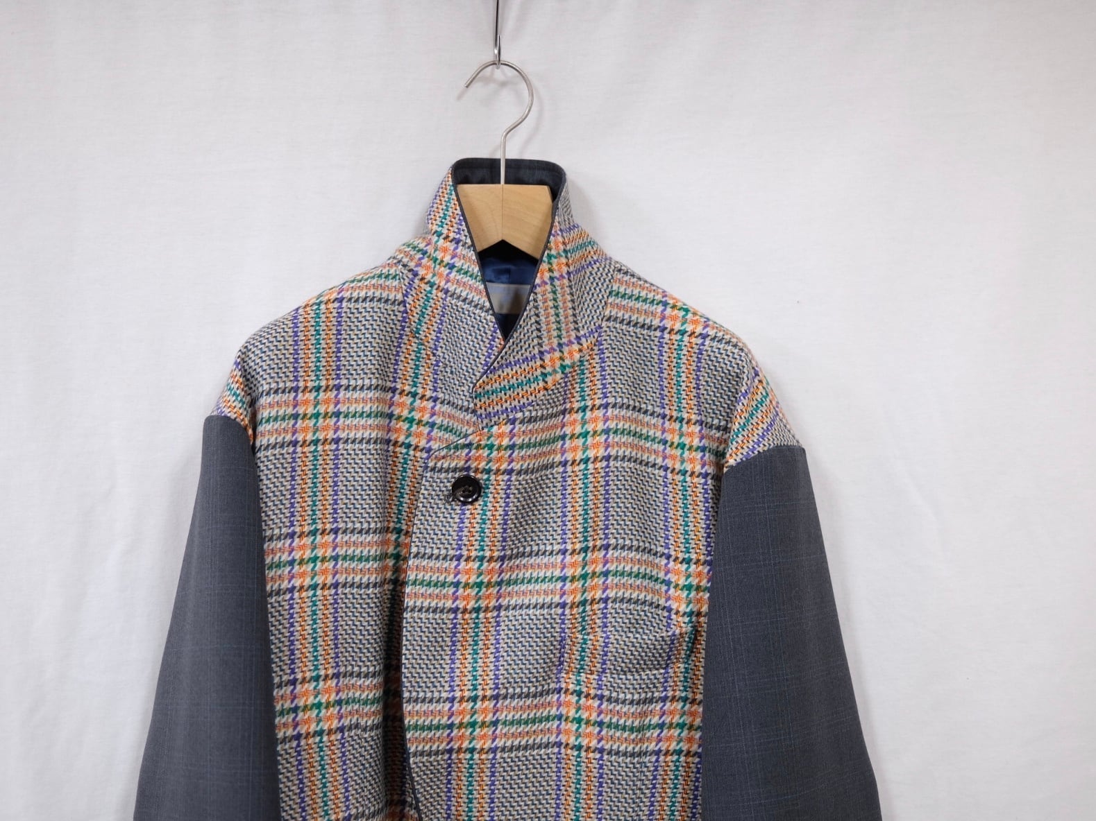 コートの様な見え方を狙ったジャケットは大判の千鳥格子で切り替えた大胆なデザインが特徴です。