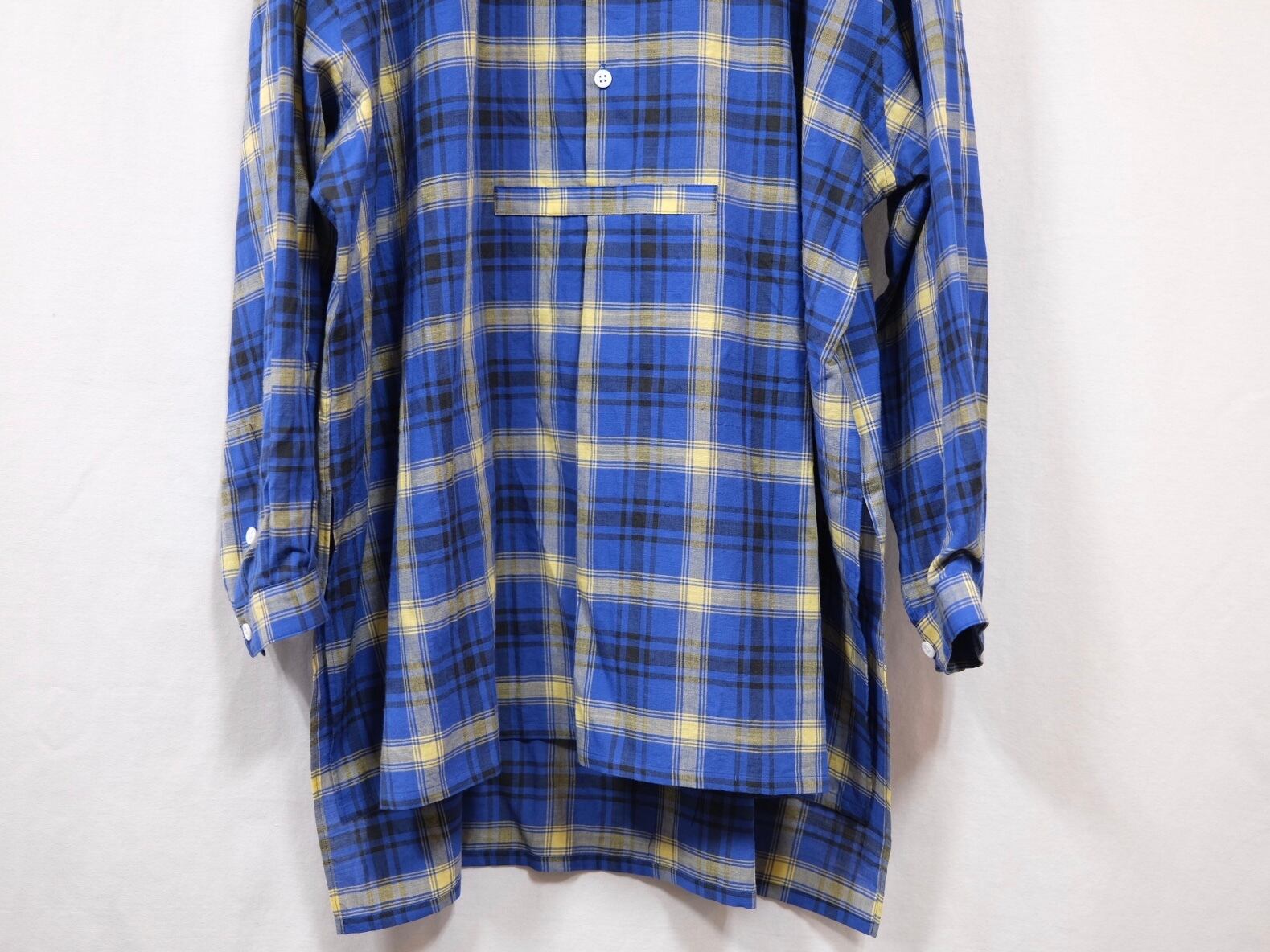 チェックのスタンドカラーシャツ。ボタンは5つ付いており、プルオーバータイプのシャツ。