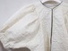 二重で織ったコットンに塩縮加工(塩化カルシウム等の塩類の水溶液の中に生地を浸し、収縮させることで凹凸やシワを作り出す加工)で柄を出したオリジナルファブリック。真鍮のボールチェーンでトリミングしたフロントオープンのパフージャケット。