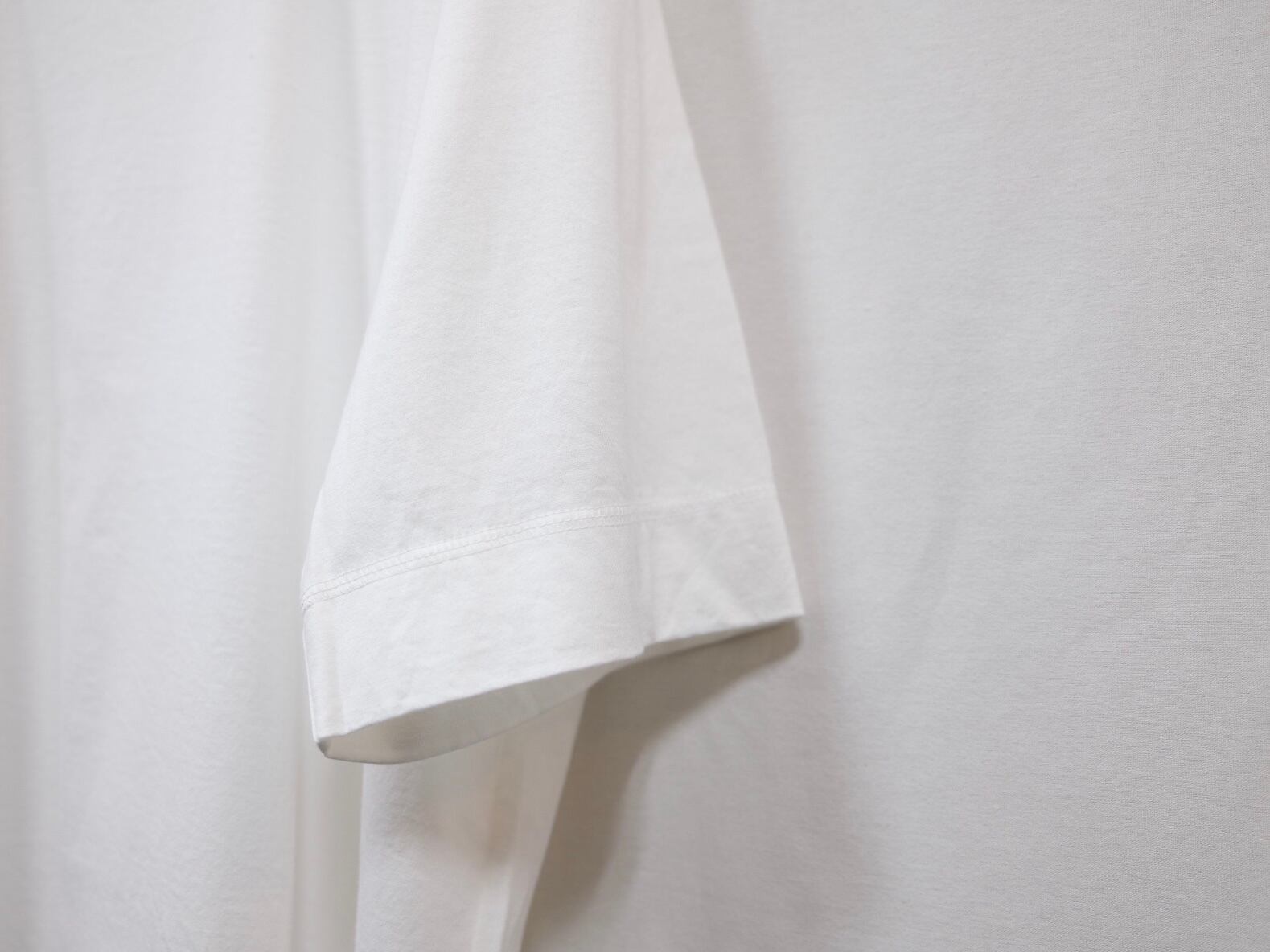 衿は生地を4つ巻きで仕上げ、だれないようにし、袖付けはジャケットのような立体裁断を応用して付けられている。また脇にスリットを配し後裾はラウンドにする事で変化をつけインナーとして着た時もポイントになる仕様。程よくゆとりのあるサイズ感で仕上げることで1枚着でも存在感をだせるようにしている。