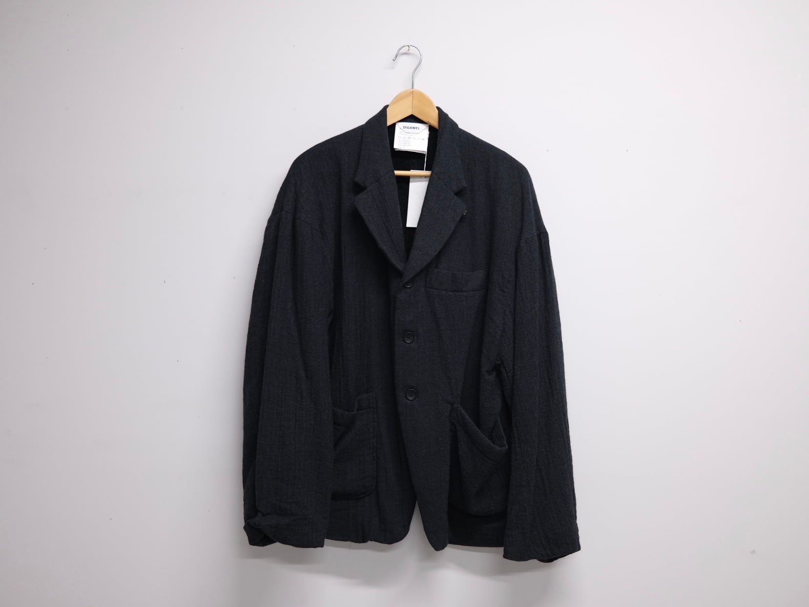 ソフトウールを使用したショート丈ジャケットに、製品洗い加工を施し、敢えて縮み、歪みを生じさせ形を崩したジャケットです。