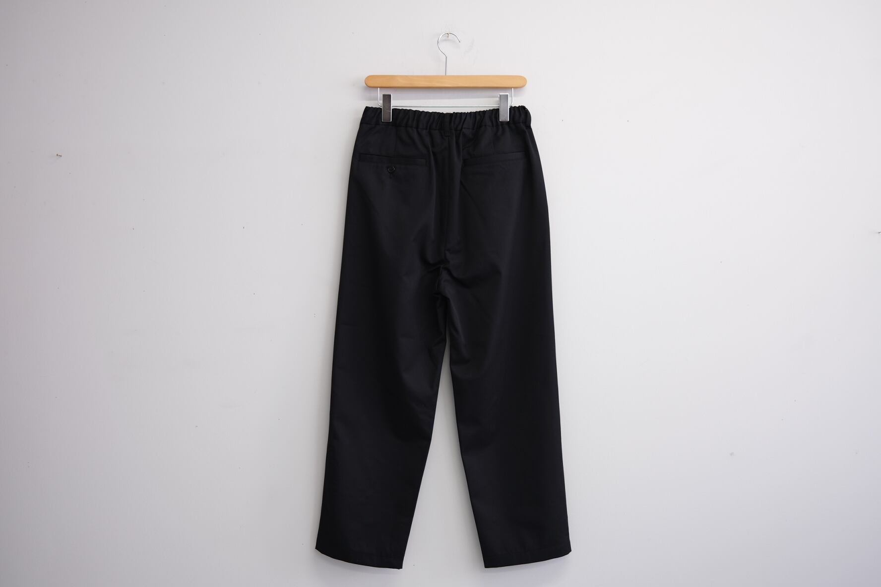 ウエストにゴムを入れ、スピンドルでイージー仕様のスラックスです。シルエットはテーパードをかけたデザイン。